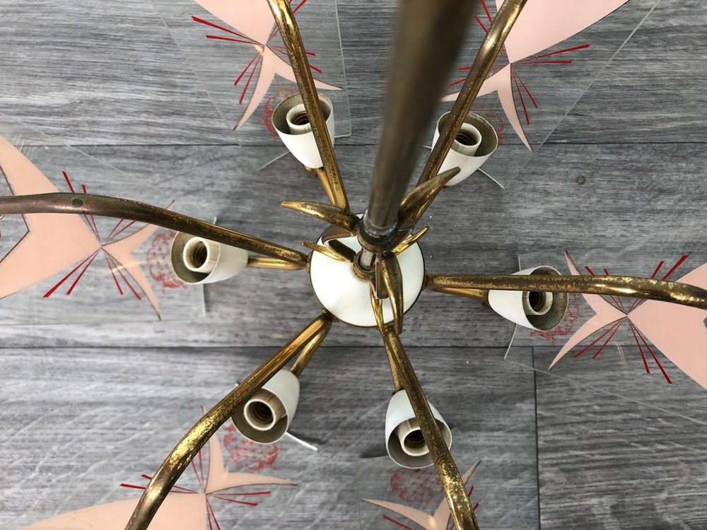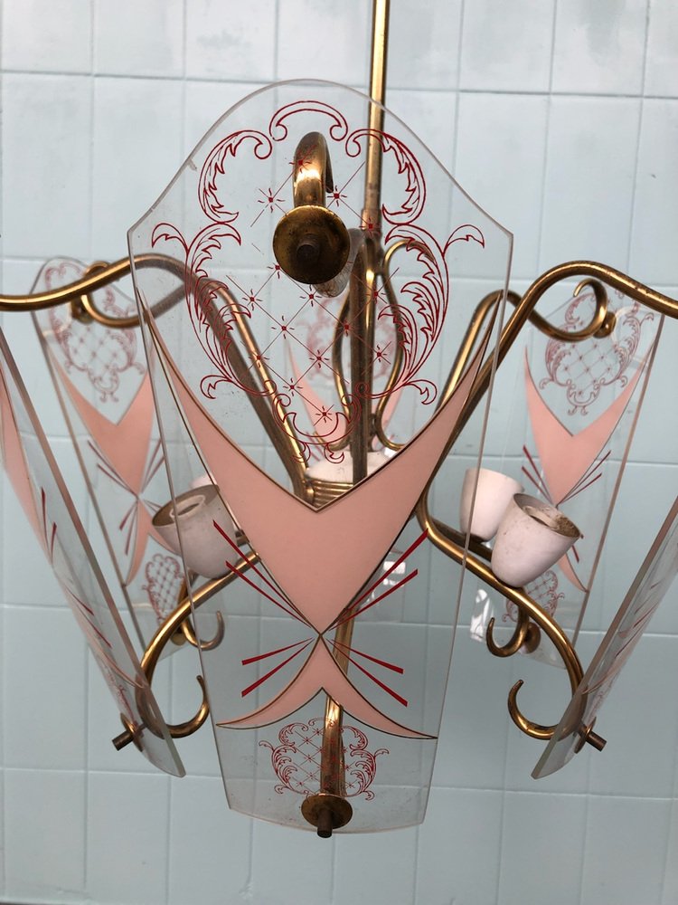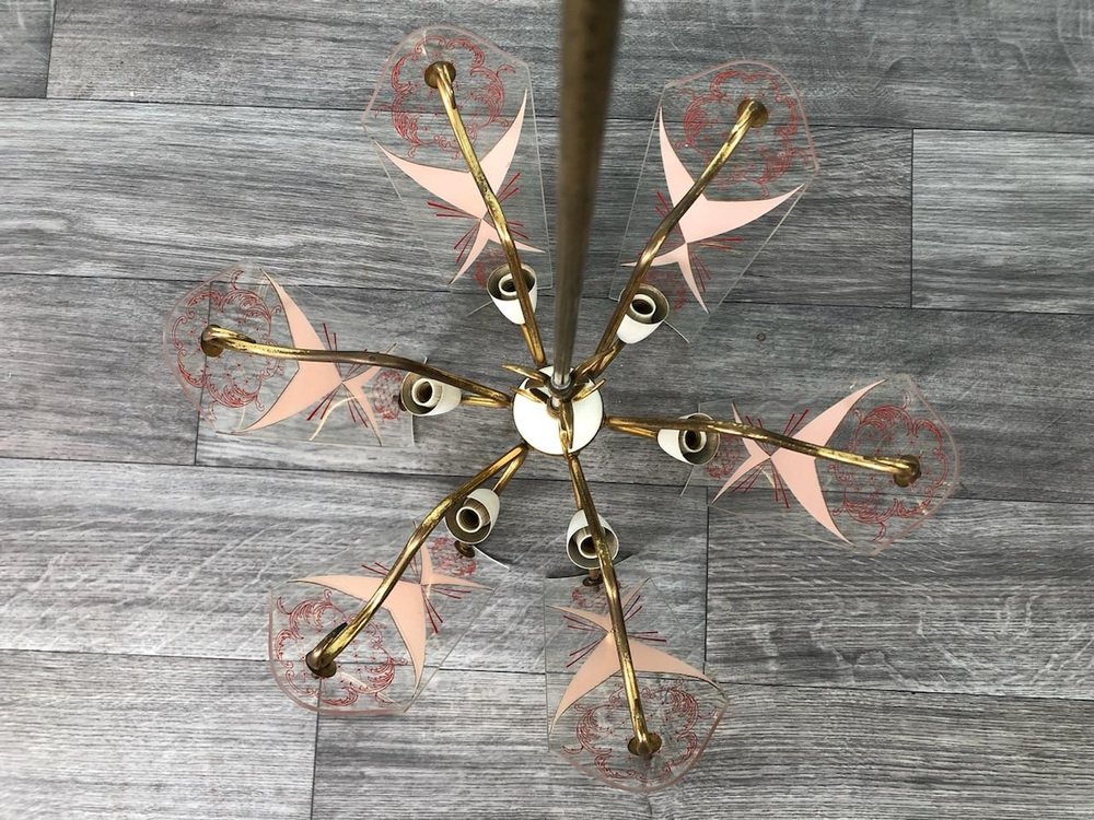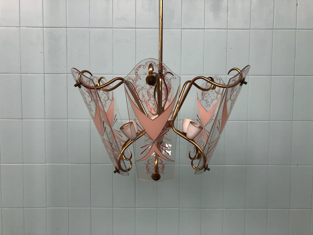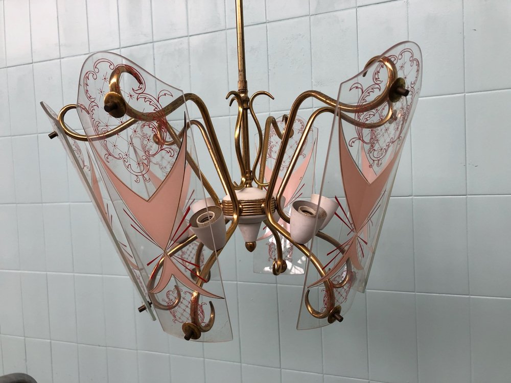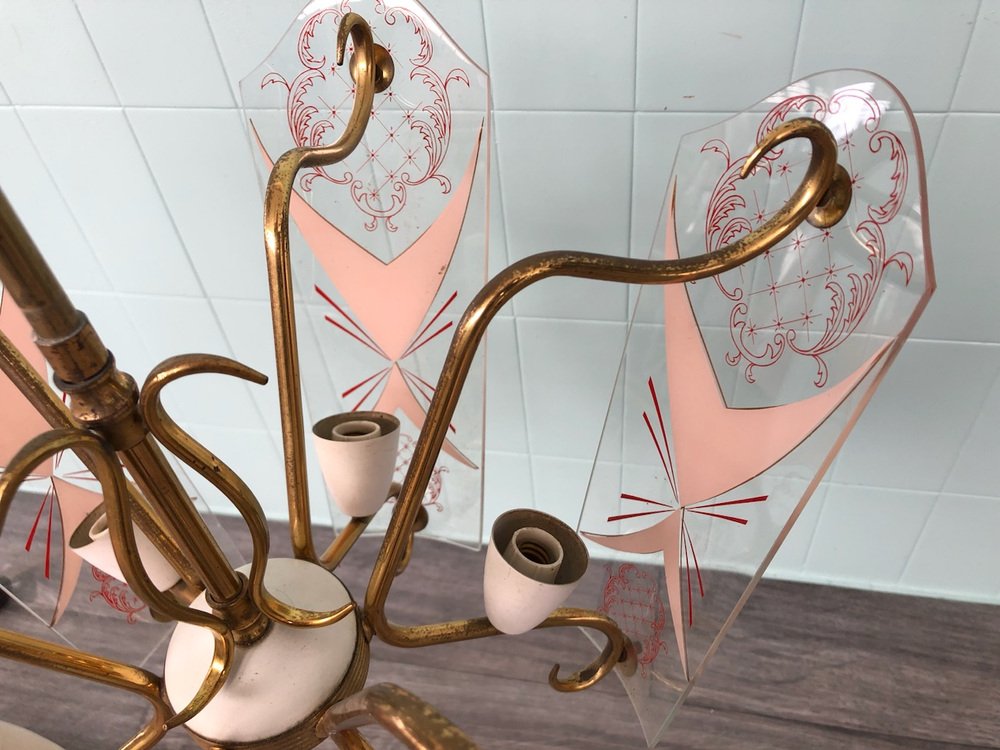 Vintage Kronleuchter aus Messing mit verzierten Glaslampenschirmen, Italien, 1950er