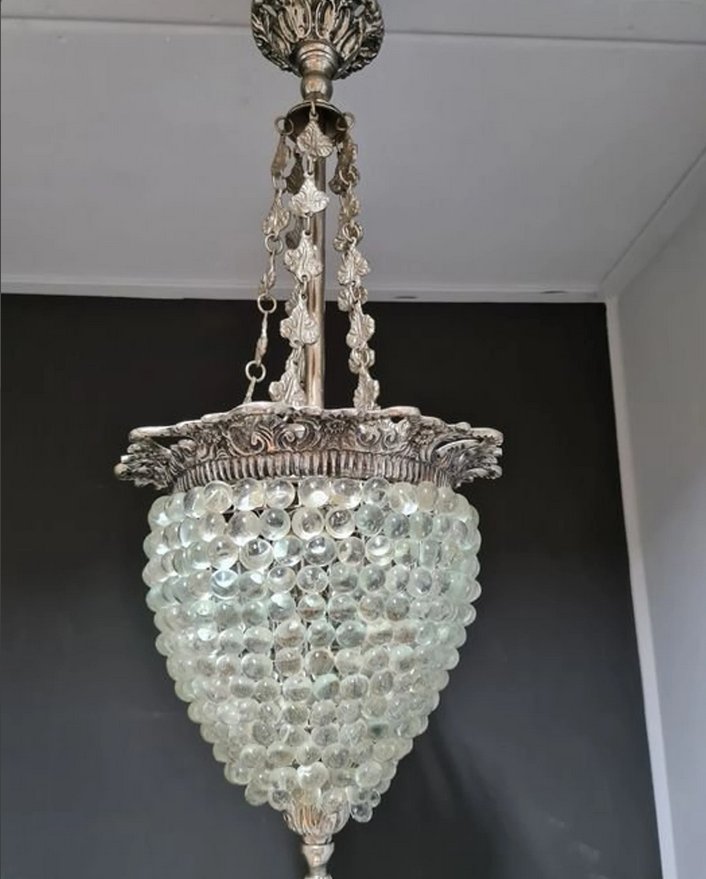 Elegant verziert mit bronzefarbenen Weinblatt-Aufhängeketten, wunderschön geschmückt mit einer reich verzierten Deckenkrone und einem Anhängergürtel, strahlt es ein sehr angenehmes und entspannendes goldenes Licht aus. Wenn jedoch weißes Licht gewünscht wird, kann eine weiße LED-Glühbirne verwendet werden, um diesen Effekt zu erzielen.