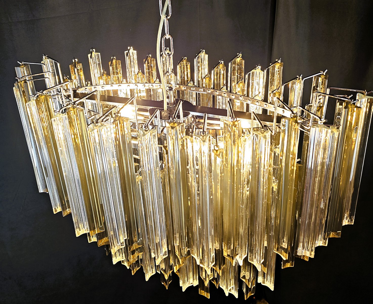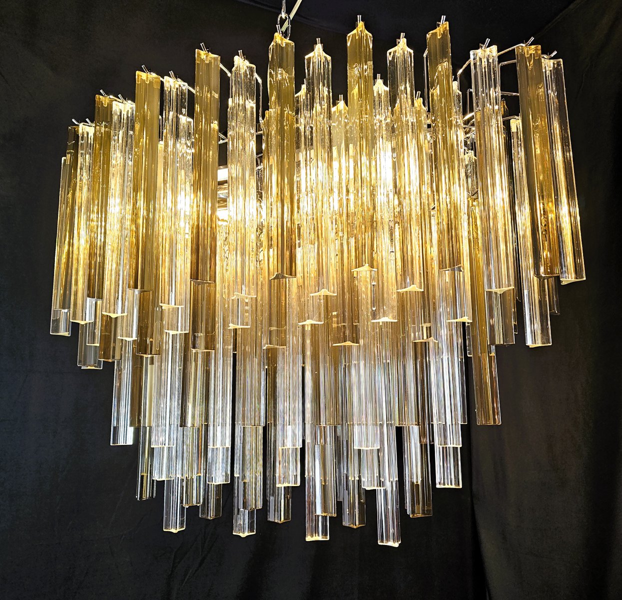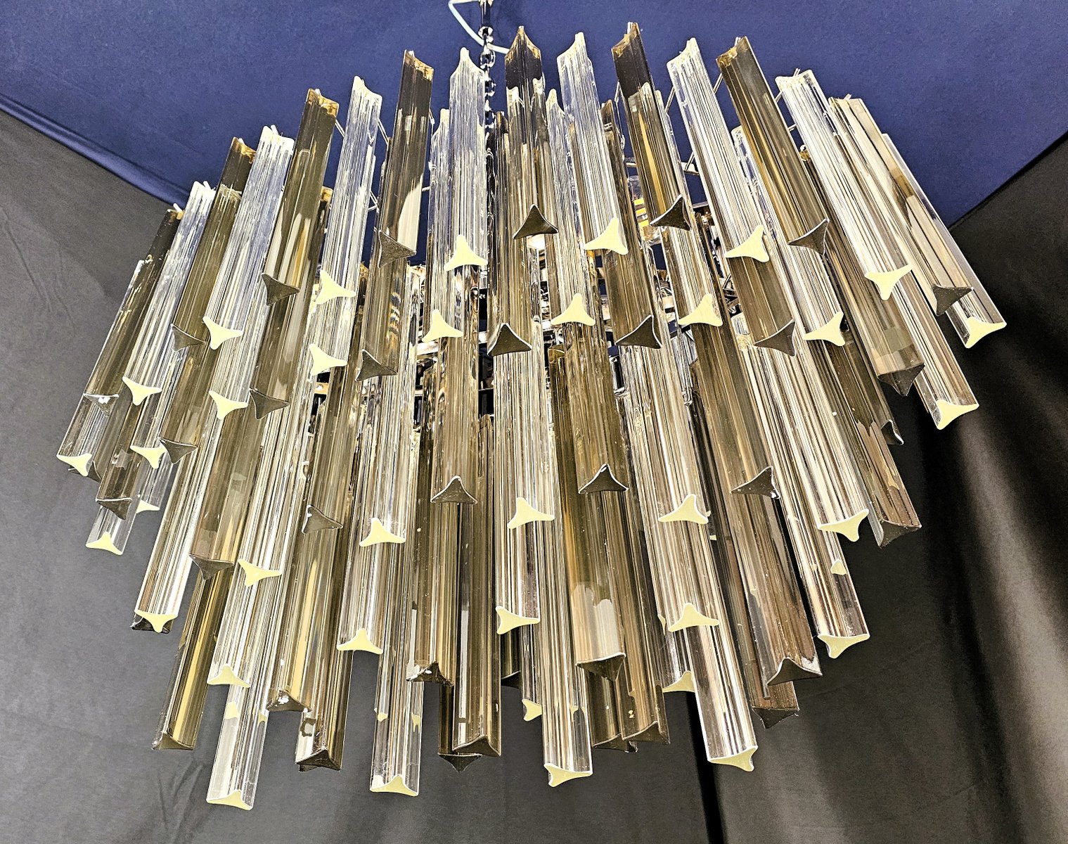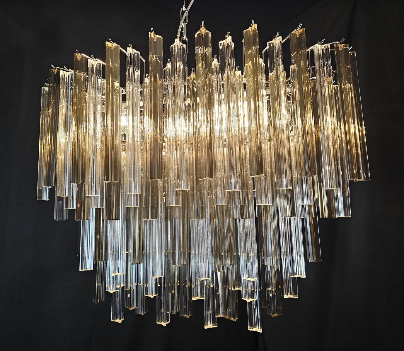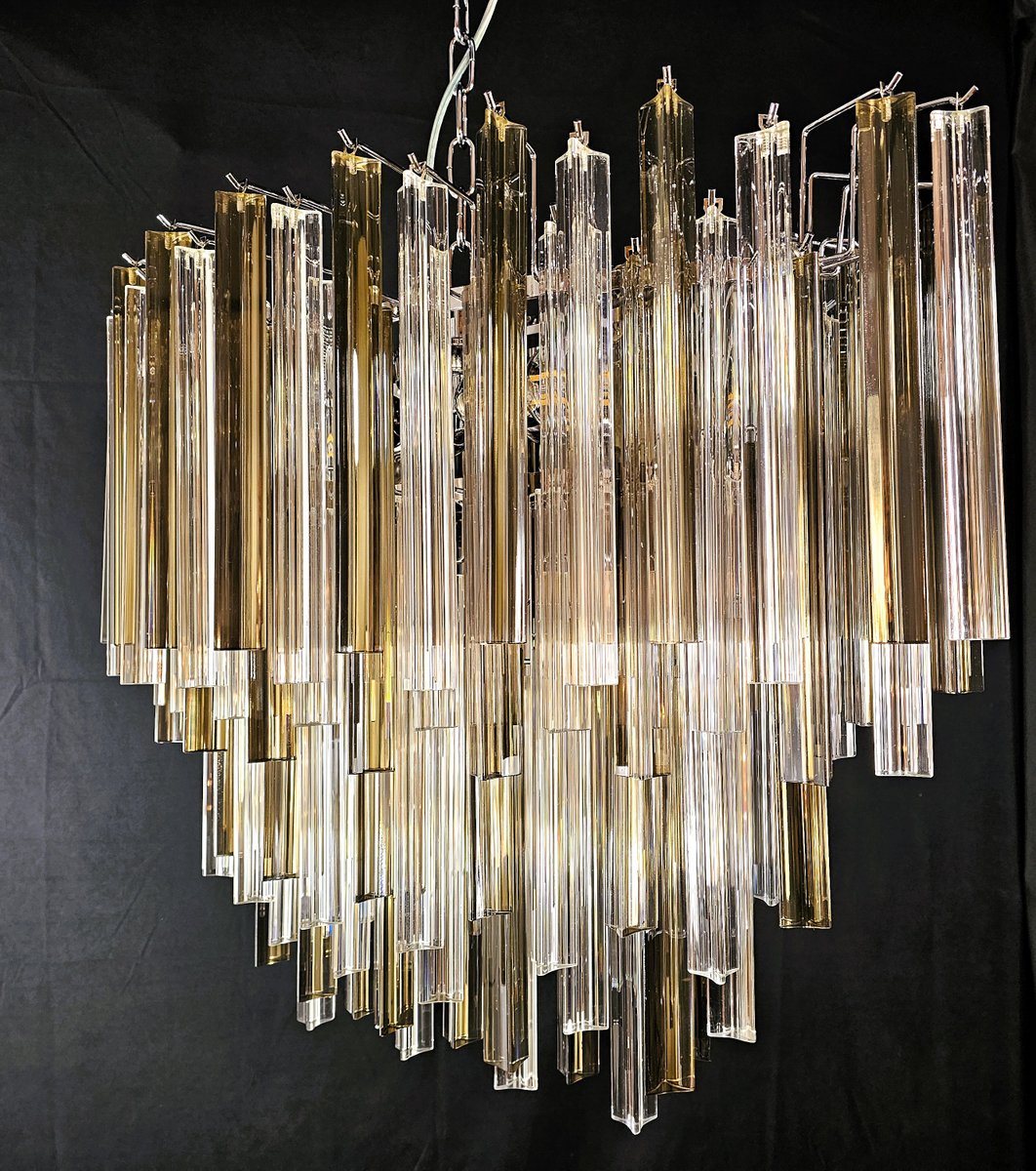 Vintage Murano chandelier, Venini style. with a beautiful oval shape, vintage style, very particular and design. with Murano glass, trihedral prisms in crystal and smoky colour. It has multiple glass planes, all positioned alternately, to give movement of light and design. Total of glass n.115. Suitable for any environment, perfect in the center of a living room or above a large table in the living room or kitchen. Its measurements are width 75 cm., depth 39 cm. and height 60 cm. Door no. 4 E 27 bulbs. (Bulbs not included). This chandelier was invented, designed and created by us.
