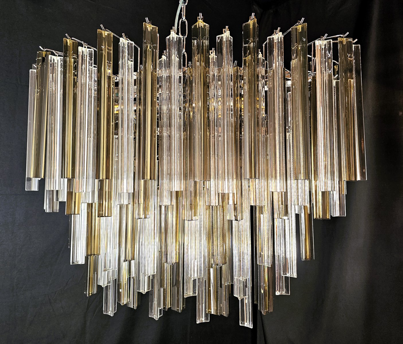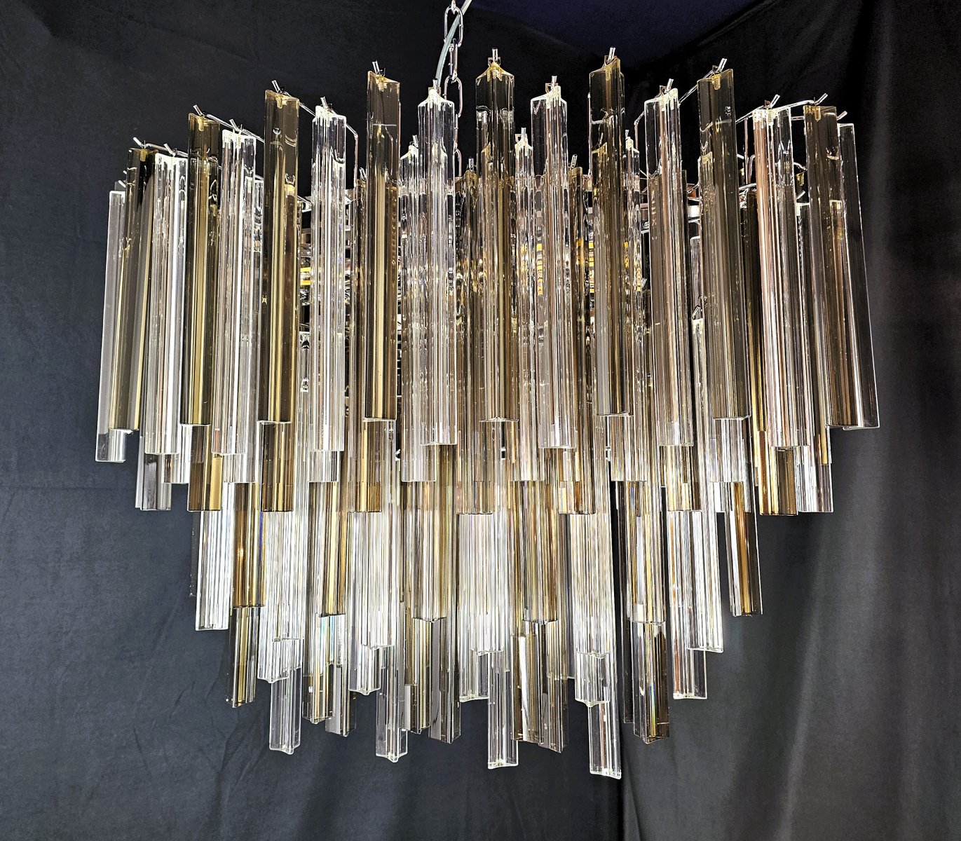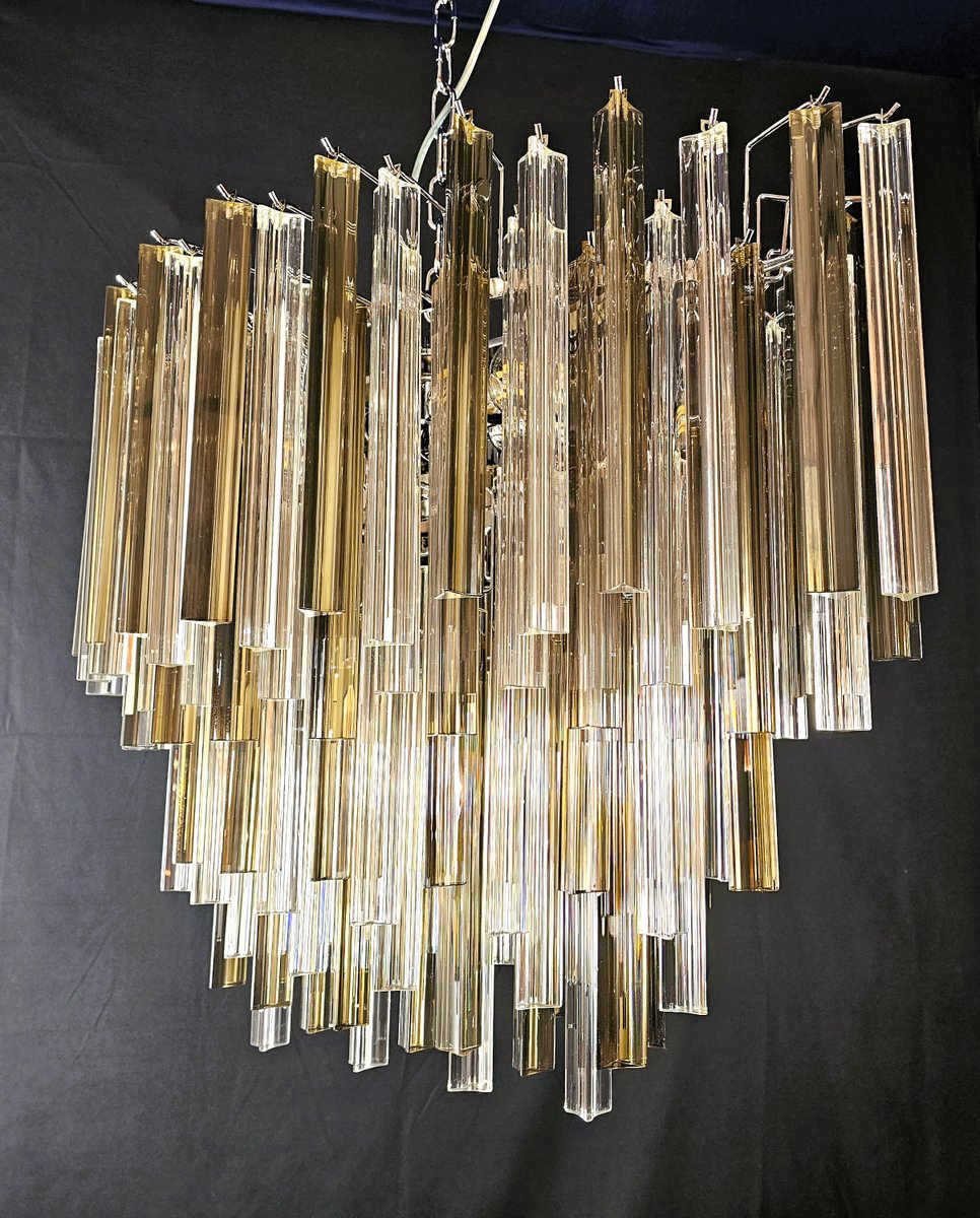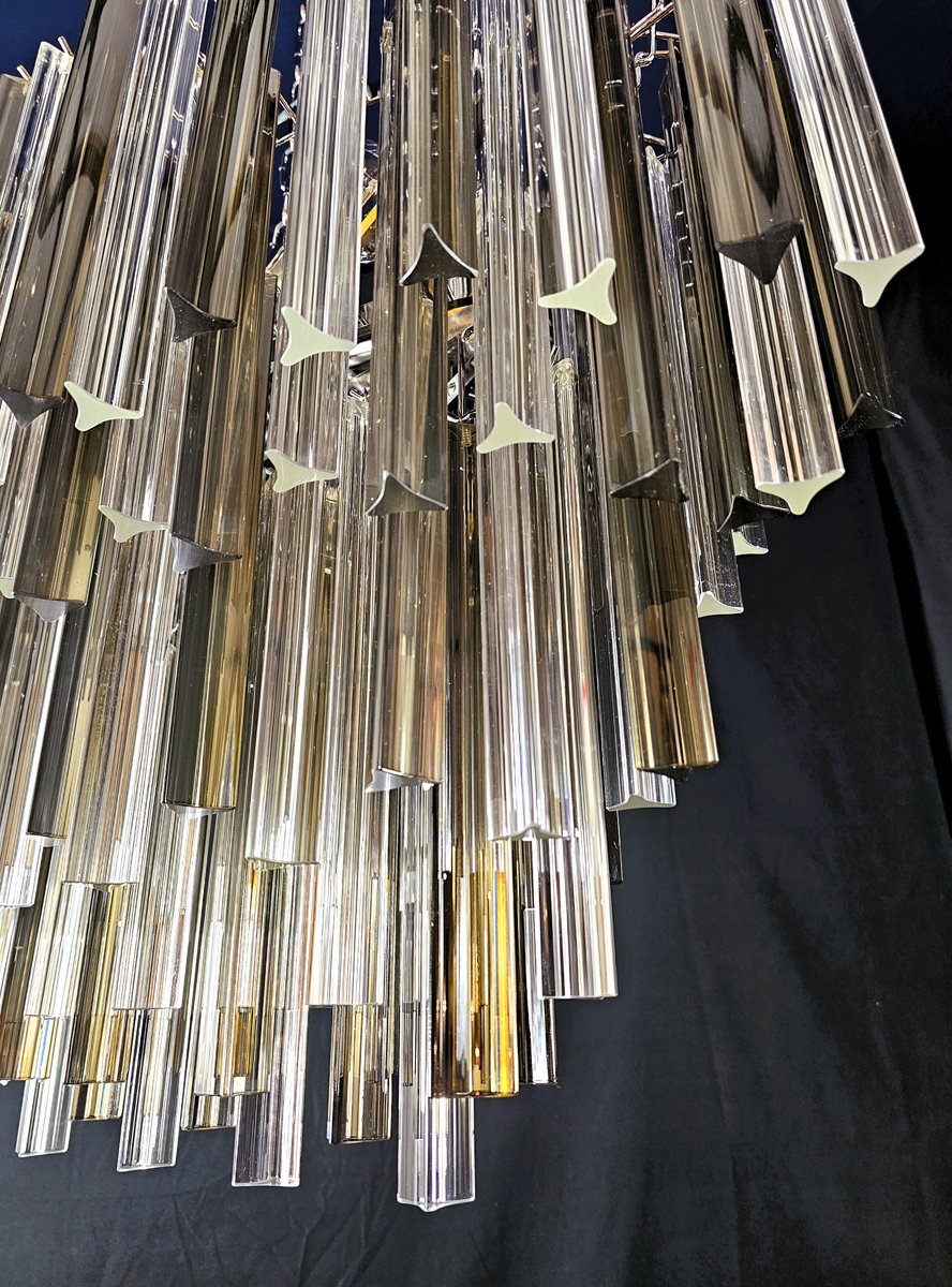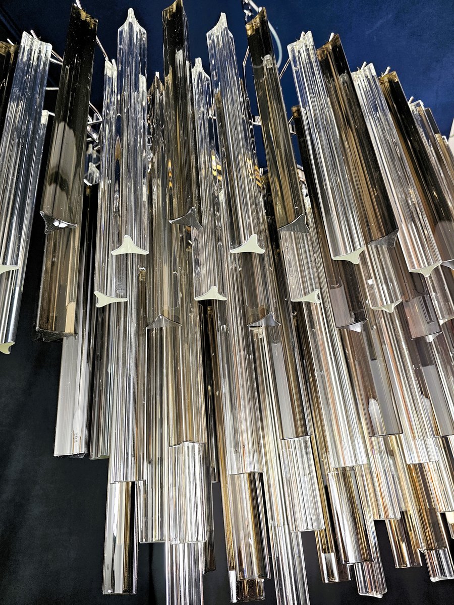 Vintage Murano Kronleuchter, Venini-Stil. mit einer schönen ovalen Form, Vintage-Stil, sehr besonders und Design. mit Murano-Glas, trihedral Prismen in Kristall und rauchige Farbe. Es hat mehrere Glasebenen, alle abwechselnd positioniert, um Bewegung von Licht und Design zu geben. Insgesamt von Glas n.115. Geeignet für jede Umgebung, perfekt in der Mitte eines Wohnzimmers oder über einem großen Tisch im Wohnzimmer oder in der Küche. Seine Maße sind Breite 75 cm, Tiefe 39 cm und Höhe 60 cm. Tür Nr. 4 E 27 Glühbirnen. (Glühbirnen nicht enthalten). Dieser Kronleuchter wurde von uns erfunden, entworfen und erstellt.