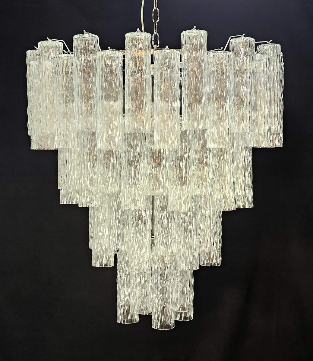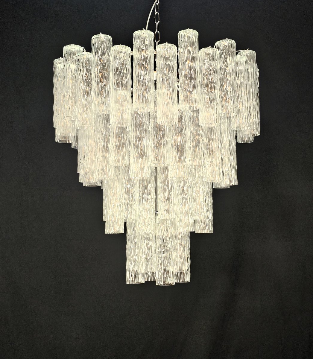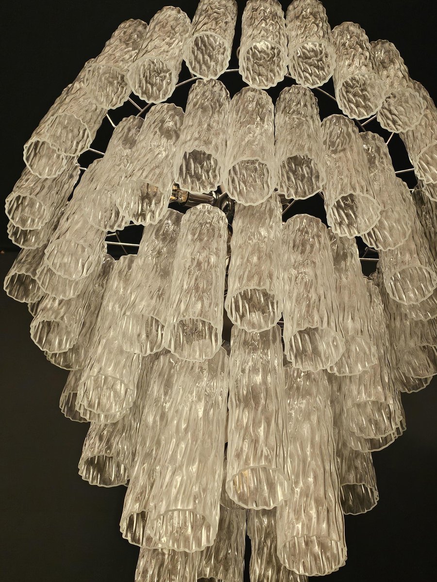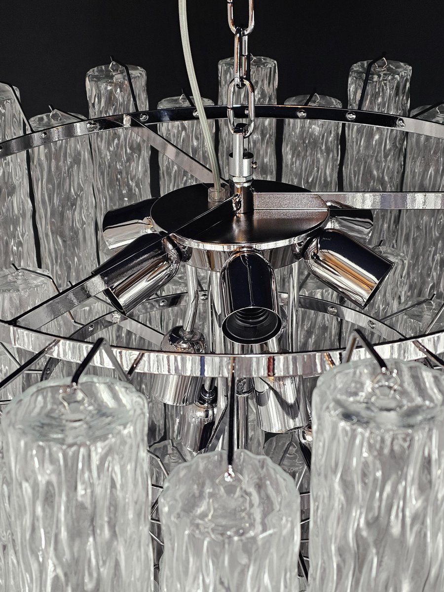 Vintage Murano-Kronleuchter, Barovier-Stil. Abwechselnd Murano-Glas, mehrere Ebenen, groß und sehr füllend. mit Murano-Glas-Zylinder-Rohr, in gearbeitet Kristall, mit einer schönen Textur. Es gibt insgesamt n Gläser. 78, und sind abwechselnd positioniert, um Bewegung zu schaffen. Dieser Kronleuchter hat ganz besondere Lichtreflexe aus verschiedenen Blickwinkeln gesehen, durch die gewellte Textur akzentuiert. Der Kronleuchter ist in schimmerndem Chrom ausgeführt. Sehr raffiniert und exklusiv, füllt er auch große Räume mit Eleganz. Mit seiner füllenden und vollständigen Form werden Sie nicht aufhören können, ihn aus tausend Lichtwinkeln zu betrachten. Von unten betrachtet ist der Kronleuchter eine wunderbare Kaskade aus glänzendem Glas. Dieser Kronleuchter hat einen Durchmesser von 78 cm. und eine Höhe von 85 cm. Tür Nr. 13 E27 Lichter (Glühbirnen nicht enthalten)