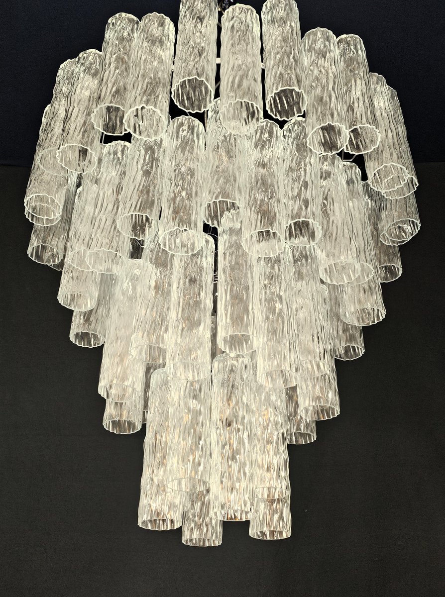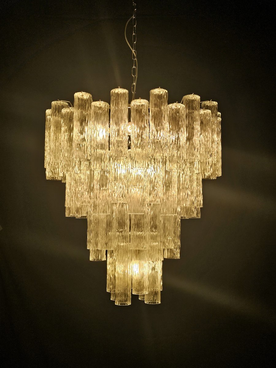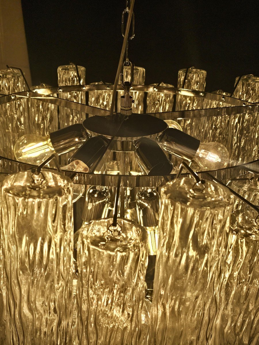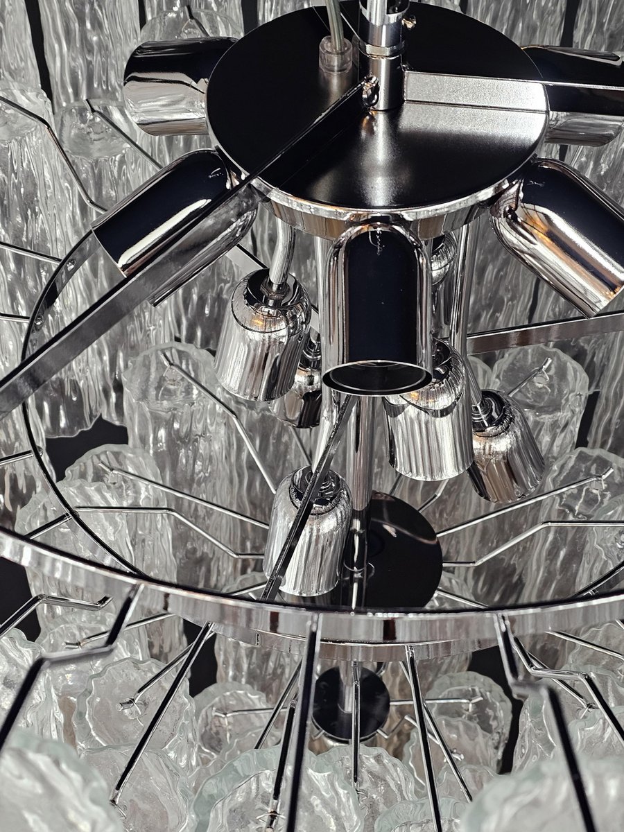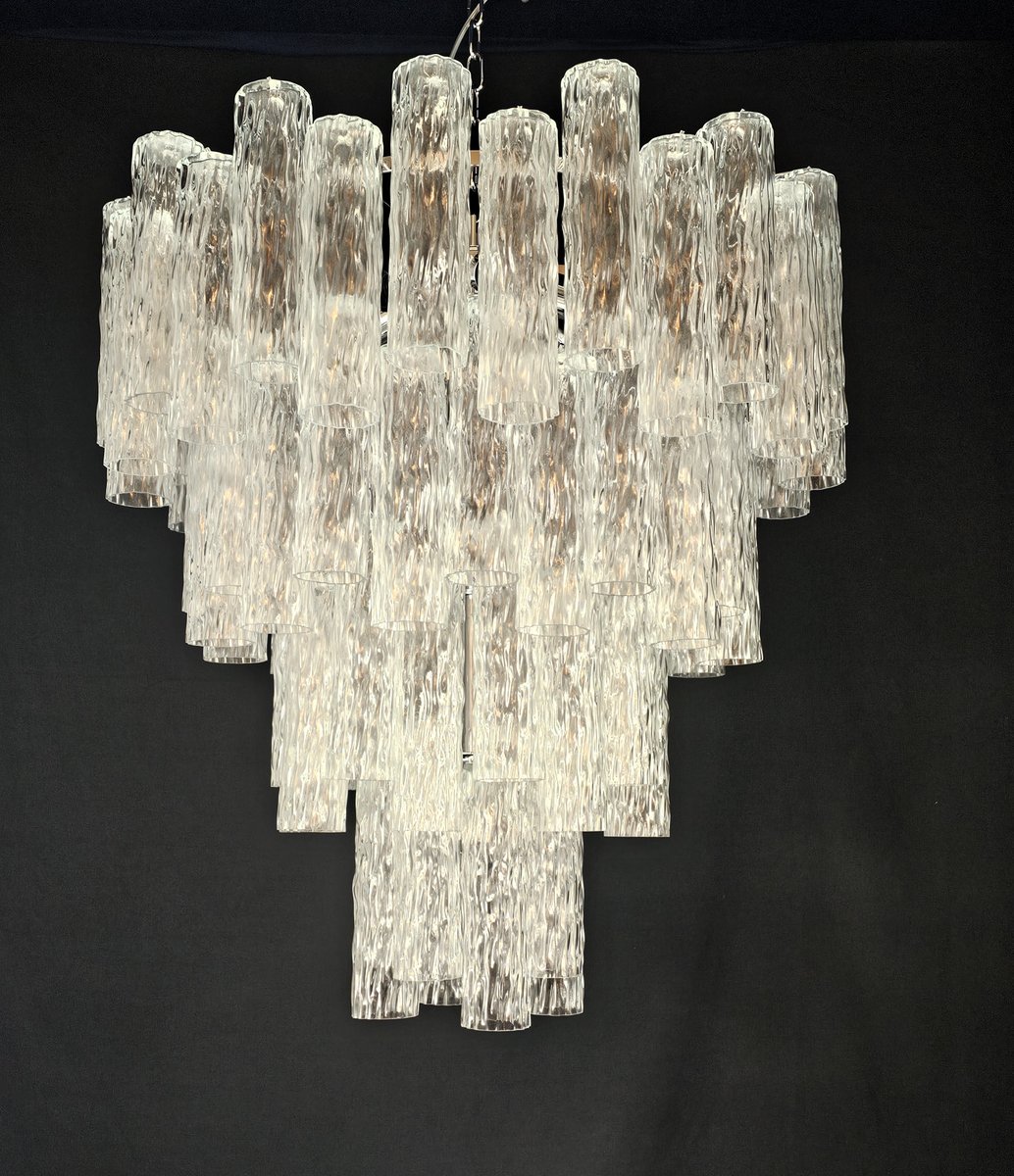 Vintage Murano-Kronleuchter, Barovier-Stil. Abwechselnd Murano-Glas, mehrere Ebenen, groß und sehr füllend. mit Murano-Glas-Zylinder-Rohr, in gearbeitet Kristall, mit einer schönen Textur. Es gibt insgesamt n Gläser. 78, und sind abwechselnd positioniert, um Bewegung zu schaffen. Dieser Kronleuchter hat ganz besondere Lichtreflexe aus verschiedenen Blickwinkeln gesehen, durch die gewellte Textur akzentuiert. Der Kronleuchter ist in schimmerndem Chrom ausgeführt. Sehr raffiniert und exklusiv, füllt er auch große Räume mit Eleganz. Mit seiner füllenden und vollständigen Form werden Sie nicht aufhören können, ihn aus tausend Lichtwinkeln zu betrachten. Von unten betrachtet ist der Kronleuchter eine wunderbare Kaskade aus glänzendem Glas. Dieser Kronleuchter hat einen Durchmesser von 78 cm. und eine Höhe von 85 cm. Tür Nr. 13 E27 Lichter (Glühbirnen nicht enthalten)