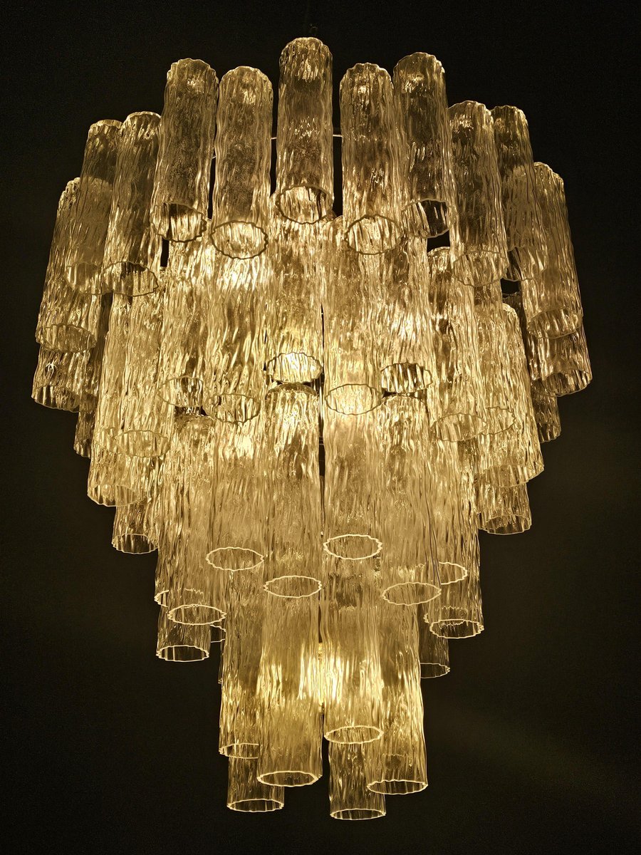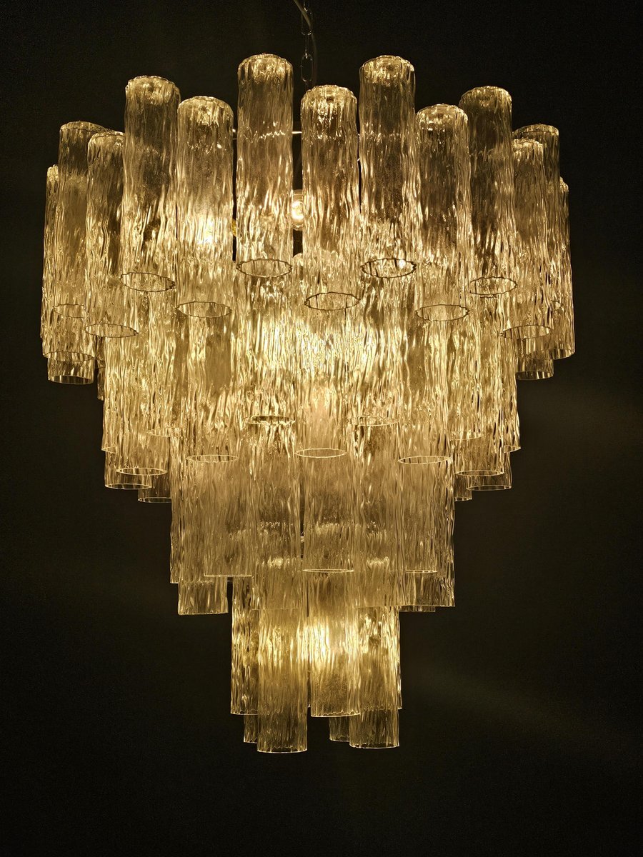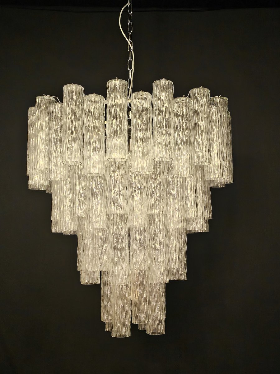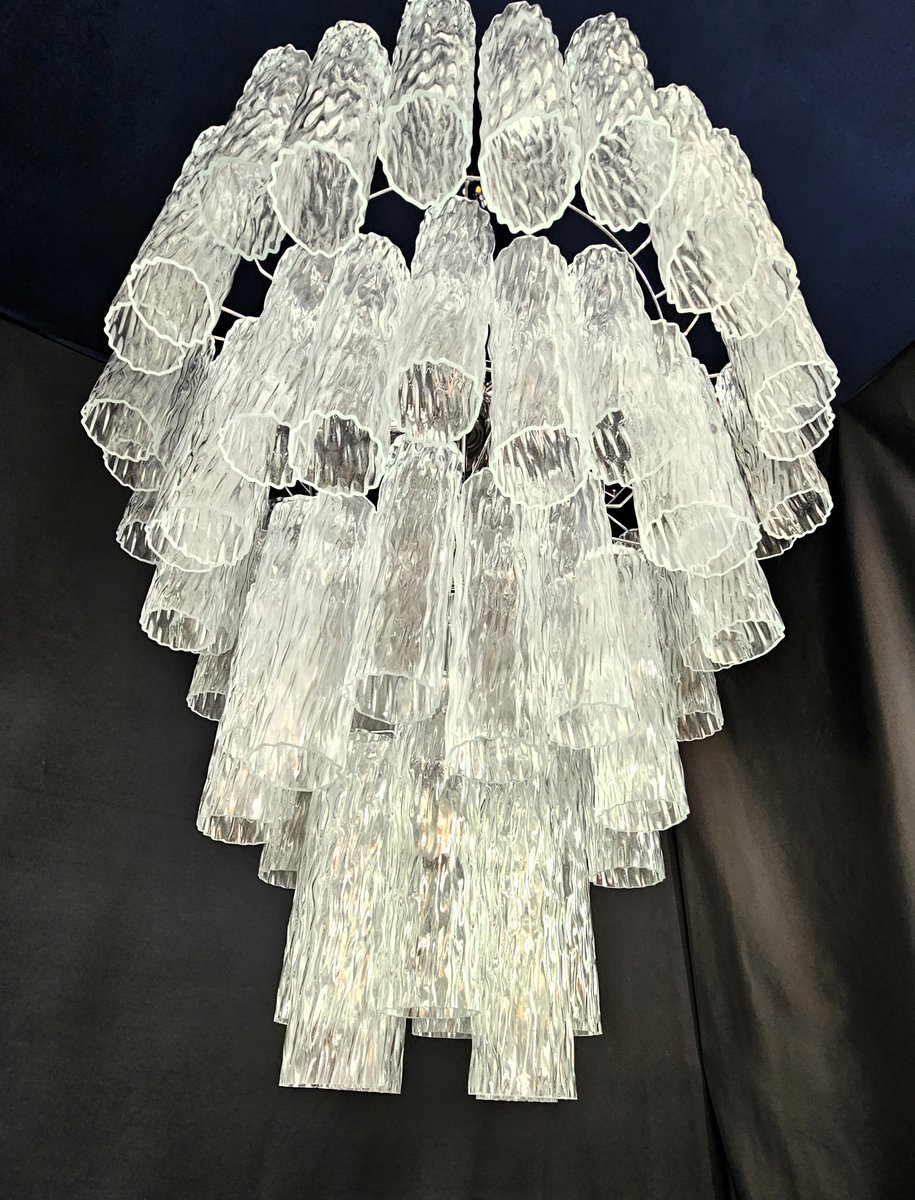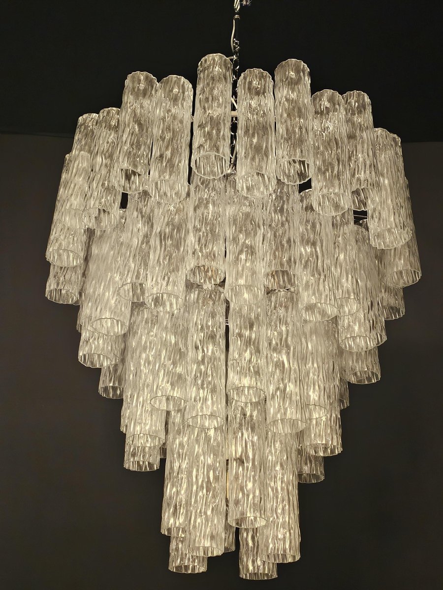 Vintage Murano-Kronleuchter, Barovier-Stil. Abwechselnd Murano-Glas, mehrere Ebenen, groß und sehr füllend. mit Murano-Glas-Zylinder-Rohr, in gearbeitet Kristall, mit einer schönen Textur. Es gibt insgesamt n Gläser. 78, und sind abwechselnd positioniert, um Bewegung zu schaffen. Dieser Kronleuchter hat ganz besondere Lichtreflexe aus verschiedenen Blickwinkeln gesehen, durch die gewellte Textur akzentuiert. Der Kronleuchter ist in schimmerndem Chrom ausgeführt. Sehr raffiniert und exklusiv, füllt er auch große Räume mit Eleganz. Mit seiner füllenden und vollständigen Form werden Sie nicht aufhören können, ihn aus tausend Lichtwinkeln zu betrachten. Von unten betrachtet ist der Kronleuchter eine wunderbare Kaskade aus glänzendem Glas. Dieser Kronleuchter hat einen Durchmesser von 78 cm. und eine Höhe von 85 cm. Tür Nr. 13 E27 Lichter (Glühbirnen nicht enthalten)