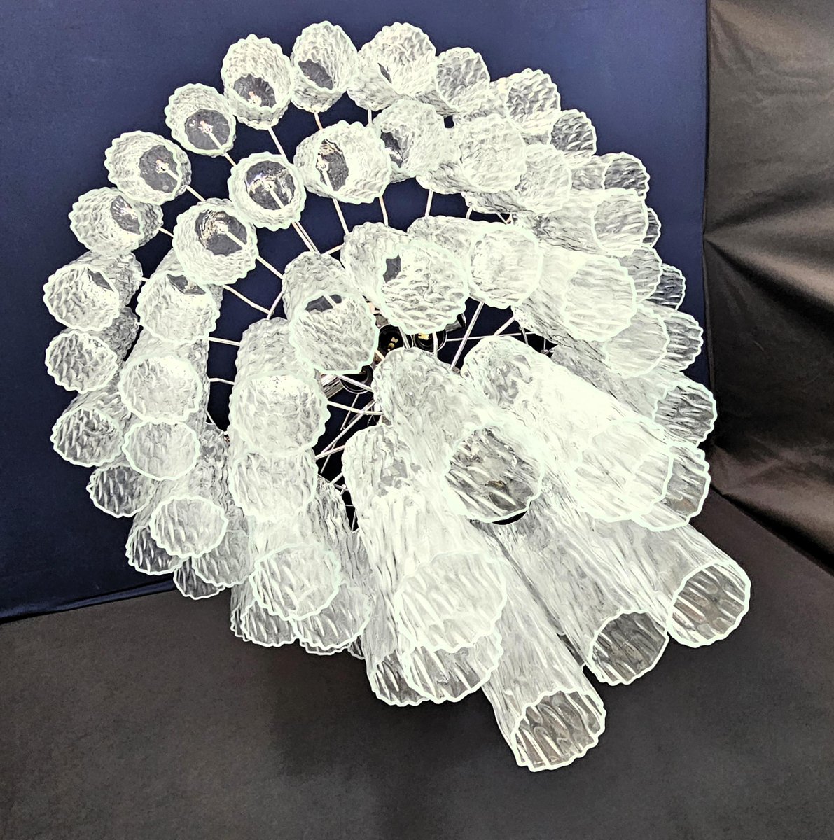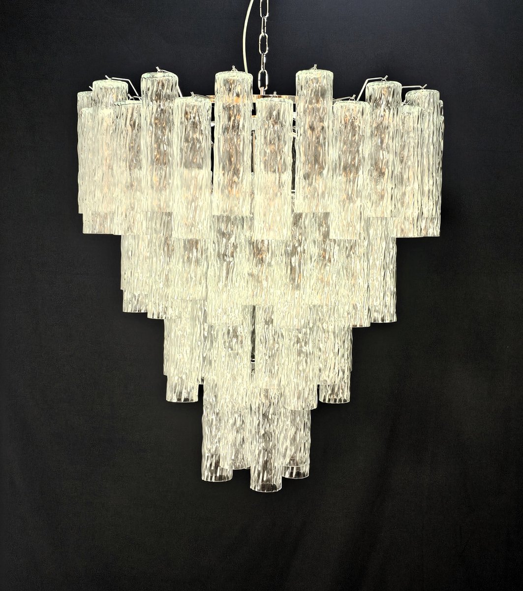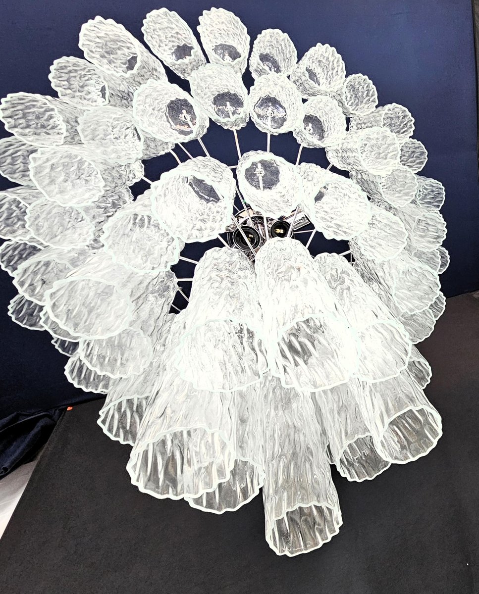 Vintage Murano chandelier, Barovier style. Alternating Murano glass, multiple levels, large and very filling. with Murano glass cylinder tube, in worked crystal, with a beautiful texture. There are a total of n glasses. 78, and are positioned alternately to create movement. This chandelier has very special light reflections seen from different angles, accentuated by the rippled texture. Chandelier finish in a shimmering chrome. Very refined and exclusive, it also fills large rooms with elegance. with its filling and complete shape you won't be able to stop looking at it from a thousand angles of light. The chandelier seen from below is a stupendous cascade of brilliant glass. This chandelier has a diameter of 78 cm. and height 85 cm. Door no. 13 E27 lights (bulbs not included)