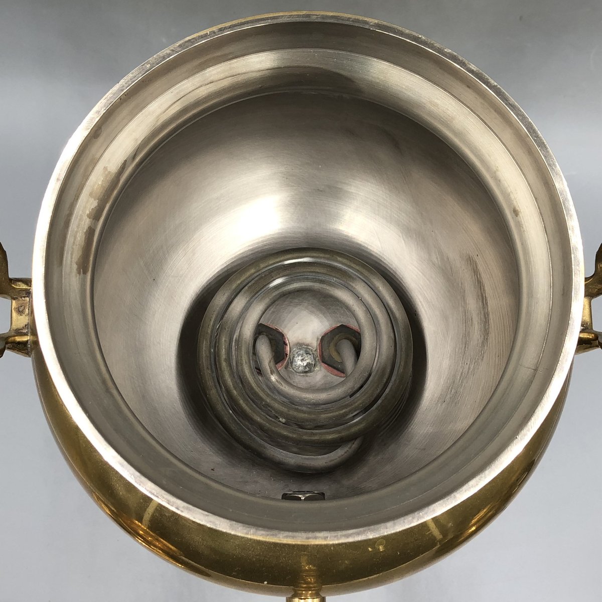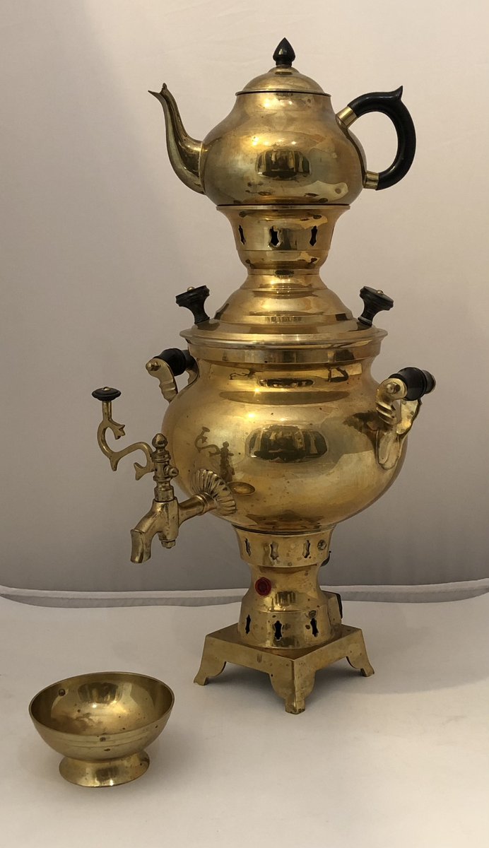 This magnificent samovar made of shiny brass is a true highlight of traditional tea culture and combines functionality with decorative charm. with a height of 50 cm, a width of 27 cm and a depth of 29 cm, it is not only an impressive display piece, but also a practical device for making tea. The samovar is electrically powered, as evidenced by the included power cord, making it ideal for modern use.