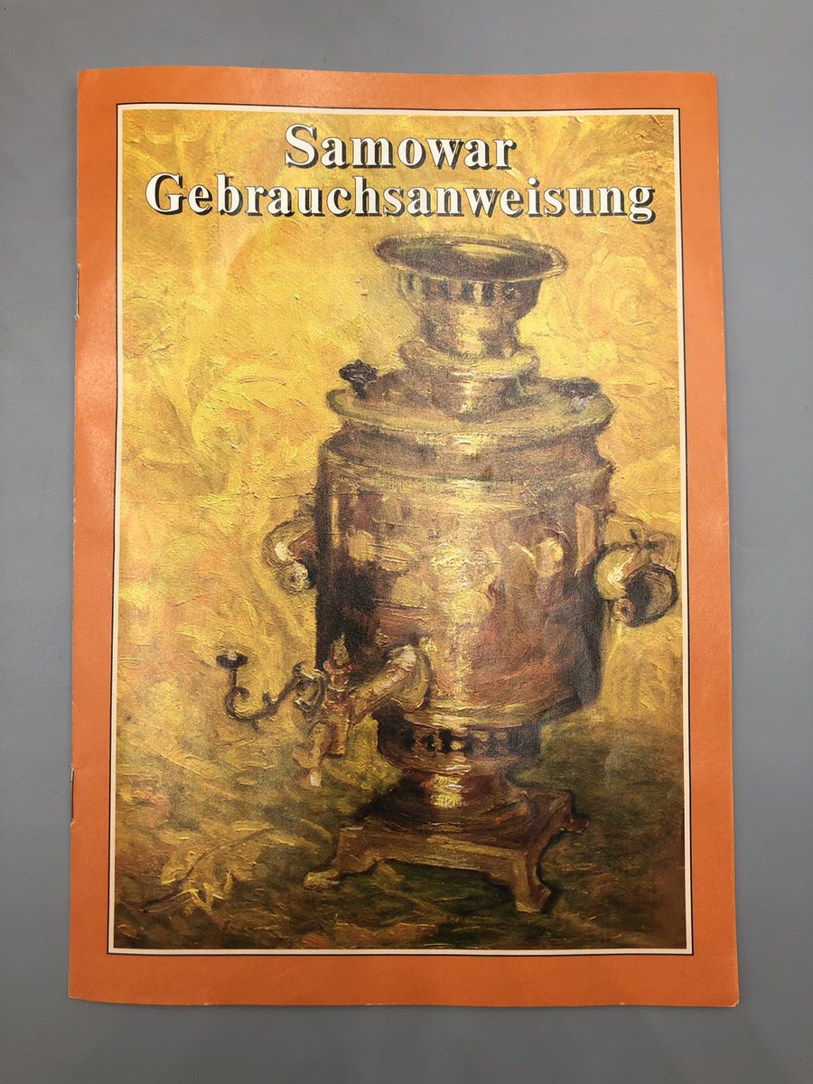 Das Set umfasst zudem einen passenden Teekessel, der auf den Samowar aufgesetzt wird, sowie eine kleine Messingschale und eine Original- Bedienungsanleitung. Der Samowar ist detailreich gestaltet, mit eleganten, geschwungenen Ausgüssen und filigranen Griffen, die einen schönen Kontrast zum glänzenden Messing bilden. Die Basis sorgt für Stabilität, während die klassisch geformte Kuppel und die geschwungenen Verzierungen den traditionellen russischen Stil widerspiegeln.