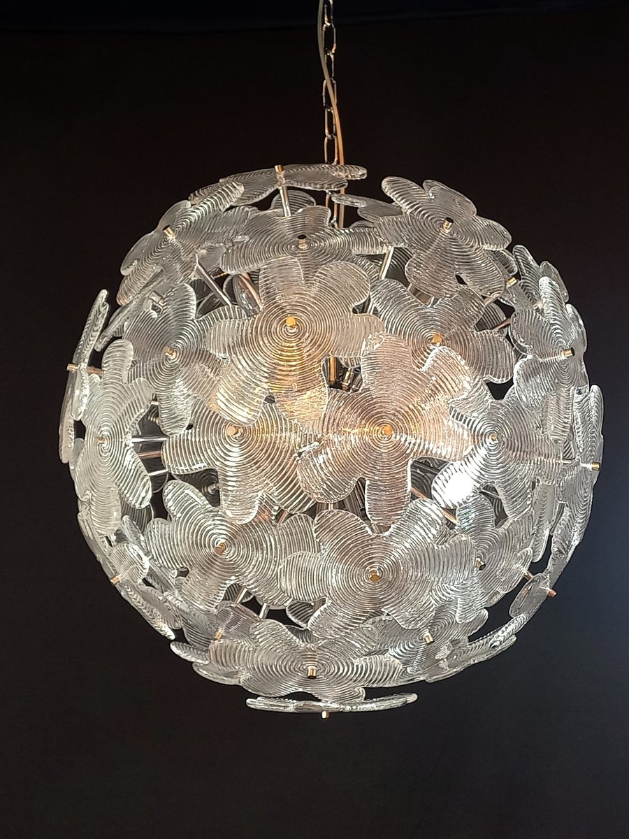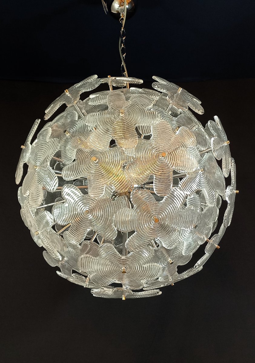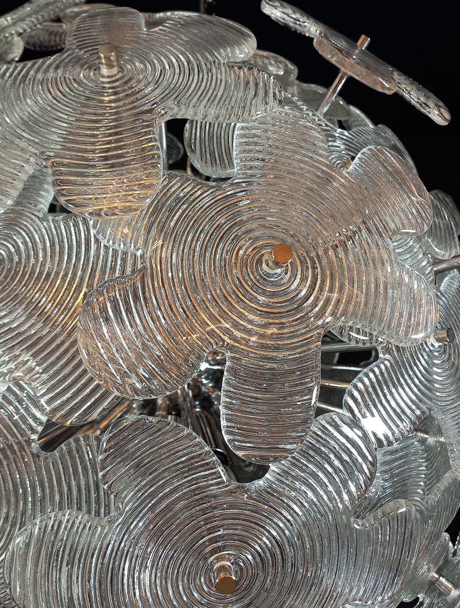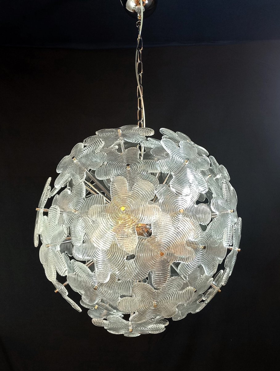 Fantastic and unobtainable Murano chandelier model Sputnik, vintage 1950s, totally invented and created by our Master. Spectacular Sputnik in polished chrome, very filling and design , with Murano glass floral style glasses, totally invented by us and made entirely by hand, in an artisanal way. Note the shape of the glass that creates double circular movement thanks to the veins, a movement that enhances even more the round shape of the sputnik and making it look like a large bouquet of crystal flowers hanging from the ceiling. The chandelier's chrome finish brings out the transparency of the glass even more, making it shiny and elegant. When turned on, the lights make the glass and the frame of the chandelier look like a golden color, as you can see from the photos, and thanks to this turning it on in a completely dark room gives strong emotions . The chandelier, which is round, has a diameter of 70 cm. and a height of 70 cm. It has a total of No. 53 Murano crystal glass, and carries No. 6 E14 lights (changeable and adaptable to US wiring as well). Summarizing: Glass Color: No. 53 Murano crystal glasses, invented, created and made entirely by hand by our Master glassmaker. Finish: polished chrome Diameter: 70 cm. Height: 70 cm. Number of Lights: 6 (Bulbs Not Included) Light Type: E 14 , 220V EU