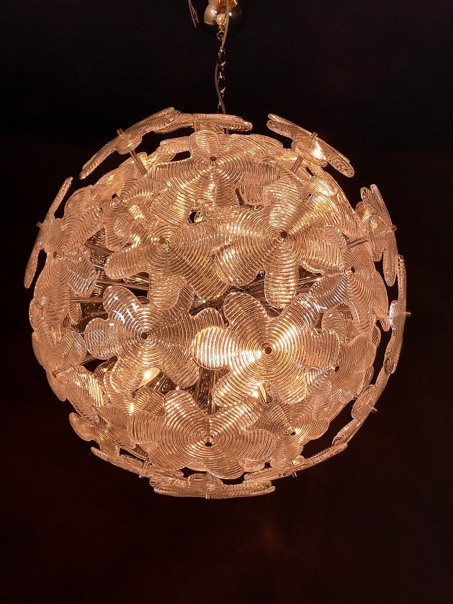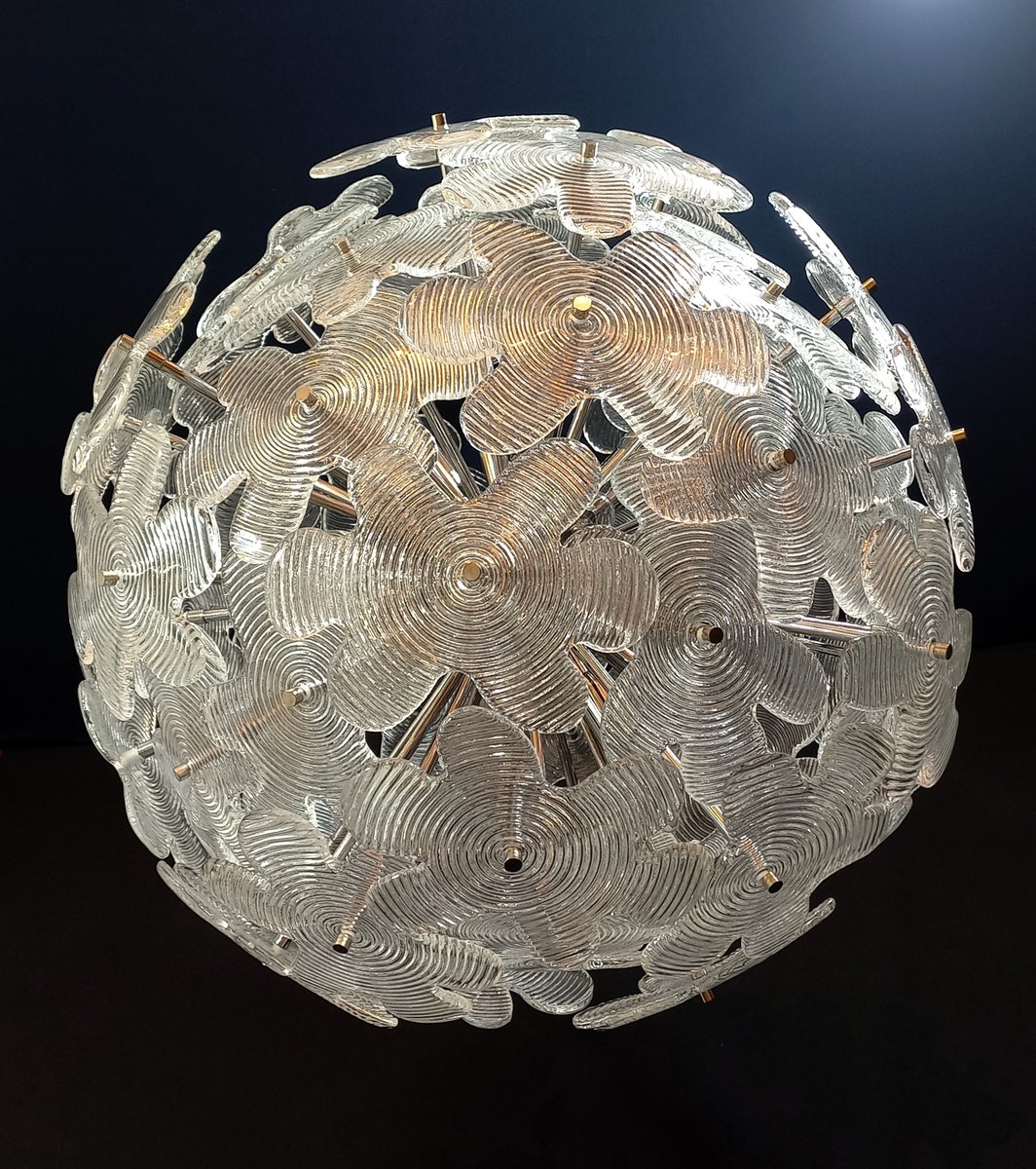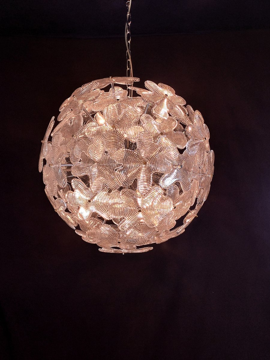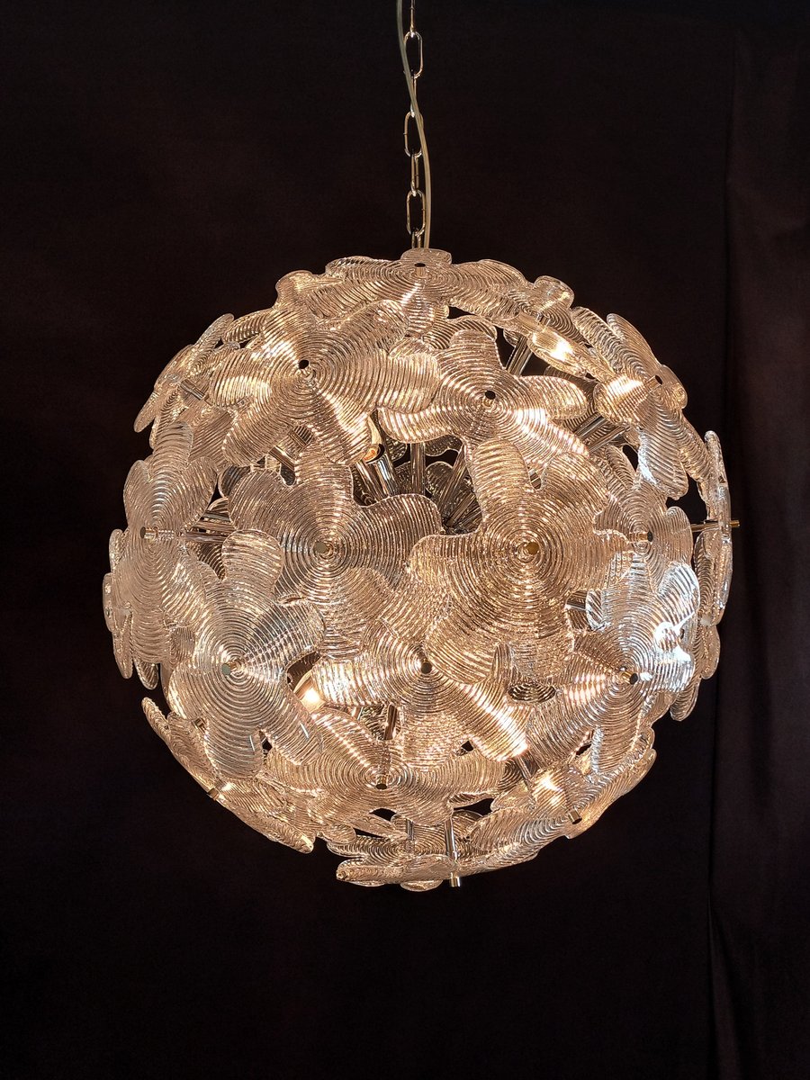Fantastic and unobtainable Murano chandelier model Sputnik, vintage 1950s, totally invented and created by our Master. Spectacular Sputnik in polished chrome, very filling and design , with Murano glass floral style glasses, totally invented by us and made entirely by hand, in an artisanal way. Note the shape of the glass that creates double circular movement thanks to the veins, a movement that enhances even more the round shape of the sputnik and making it look like a large bouquet of crystal flowers hanging from the ceiling. The chandelier's chrome finish brings out the transparency of the glass even more, making it shiny and elegant. When turned on, the lights make the glass and the frame of the chandelier look like a golden color, as you can see from the photos, and thanks to this turning it on in a completely dark room gives strong emotions . The chandelier, which is round, has a diameter of 70 cm. and a height of 70 cm. It has a total of No. 53 Murano crystal glass, and carries No. 6 E14 lights (changeable and adaptable to US wiring as well). Summarizing: Glass Color: No. 53 Murano crystal glasses, invented, created and made entirely by hand by our Master glassmaker. Finish: polished chrome Diameter: 70 cm. Height: 70 cm. Number of Lights: 6 (Bulbs Not Included) Light Type: E 14 , 220V EU