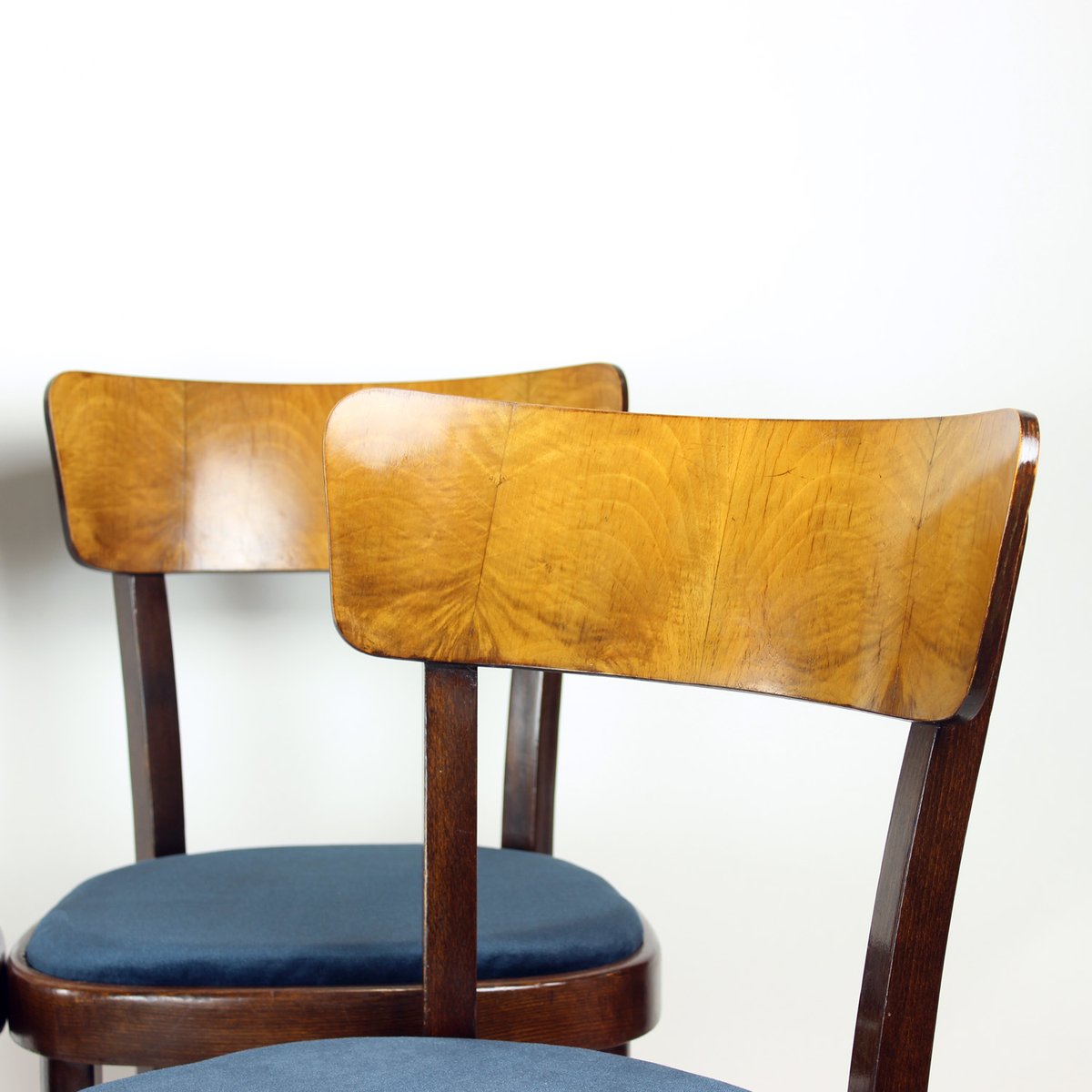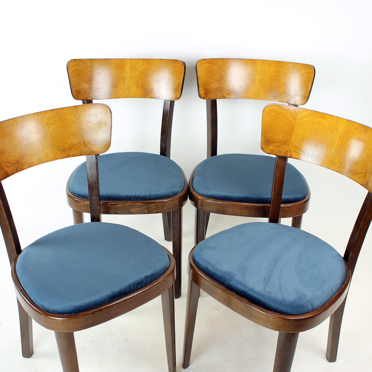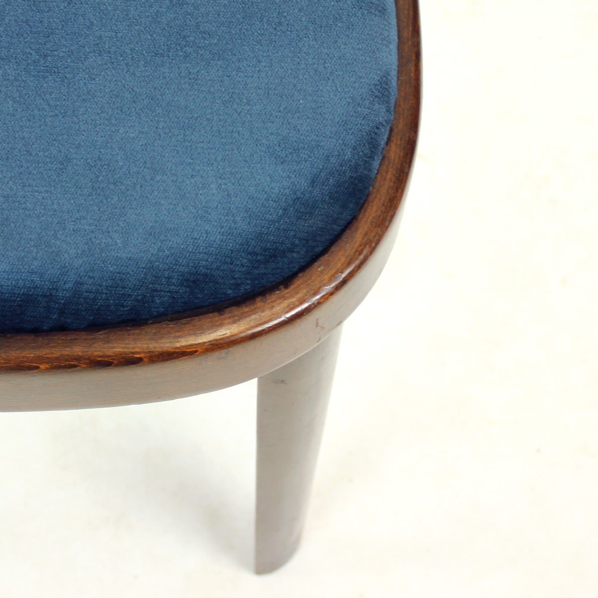 The seats have been newly upholstered in dark blue velvet. The upholstery is new, the frames remain original. The wood is in very good original condition, cleaned and maintained, with no major damage. Age-appropriate signs of use may be present.