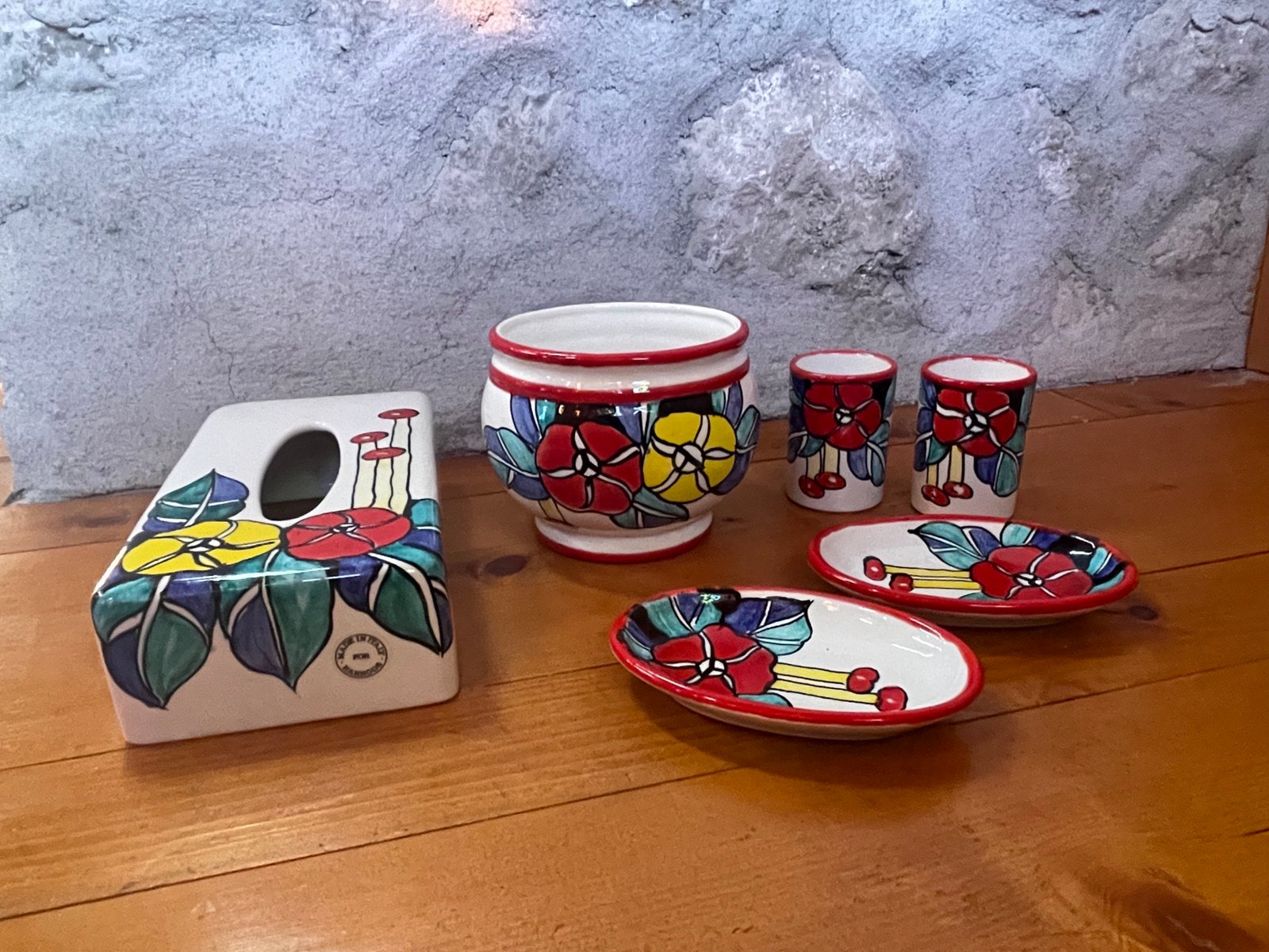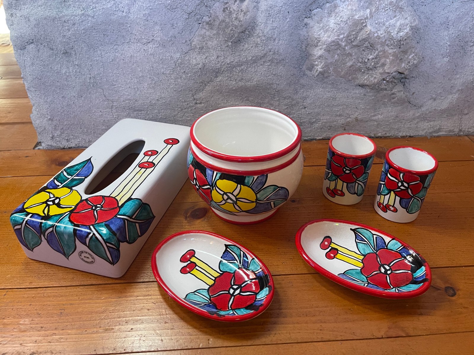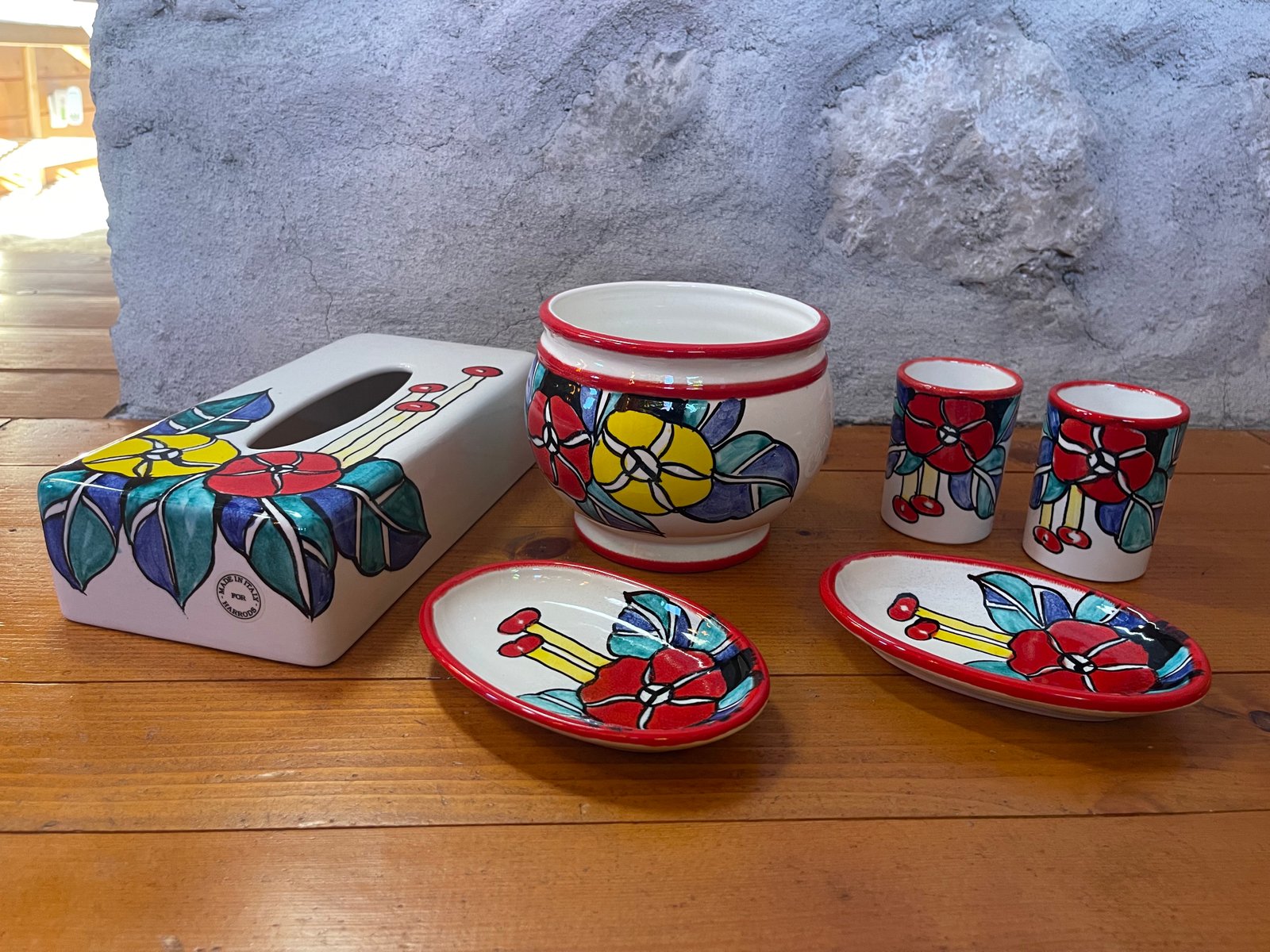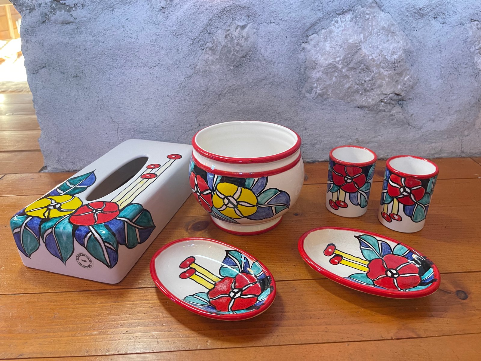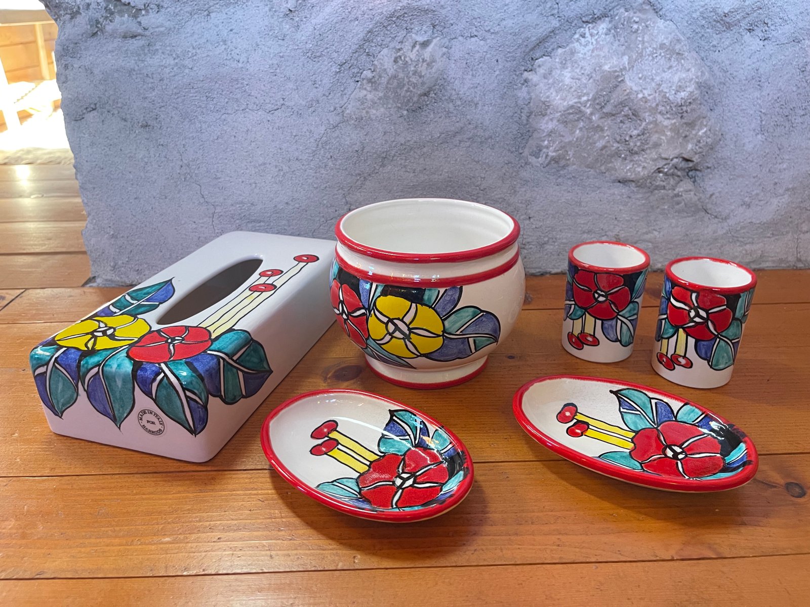 A vibrant and joyful six-piece porcelain vanity set, hand-painted in Italy exclusively for Harrods London. This rare collection includes a tissue box holder, waste bin, two toothbrush tumblers, and two small trays—each adorned with bold floral motifs in saturated hues of red, yellow, and blue with a vivid red rim.