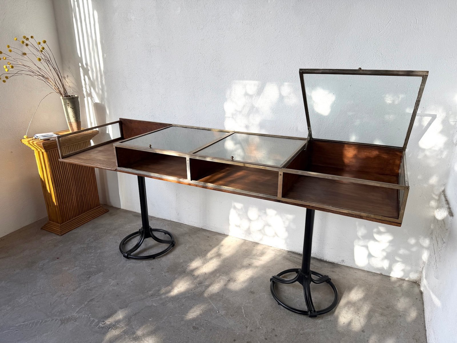 This 1950s display cabinet is distinguished by its horizontal elegance and perfect balance. Its solid oak frame is accentuated by three brass-plated metal frames, offering a refined and luminous aesthetic.