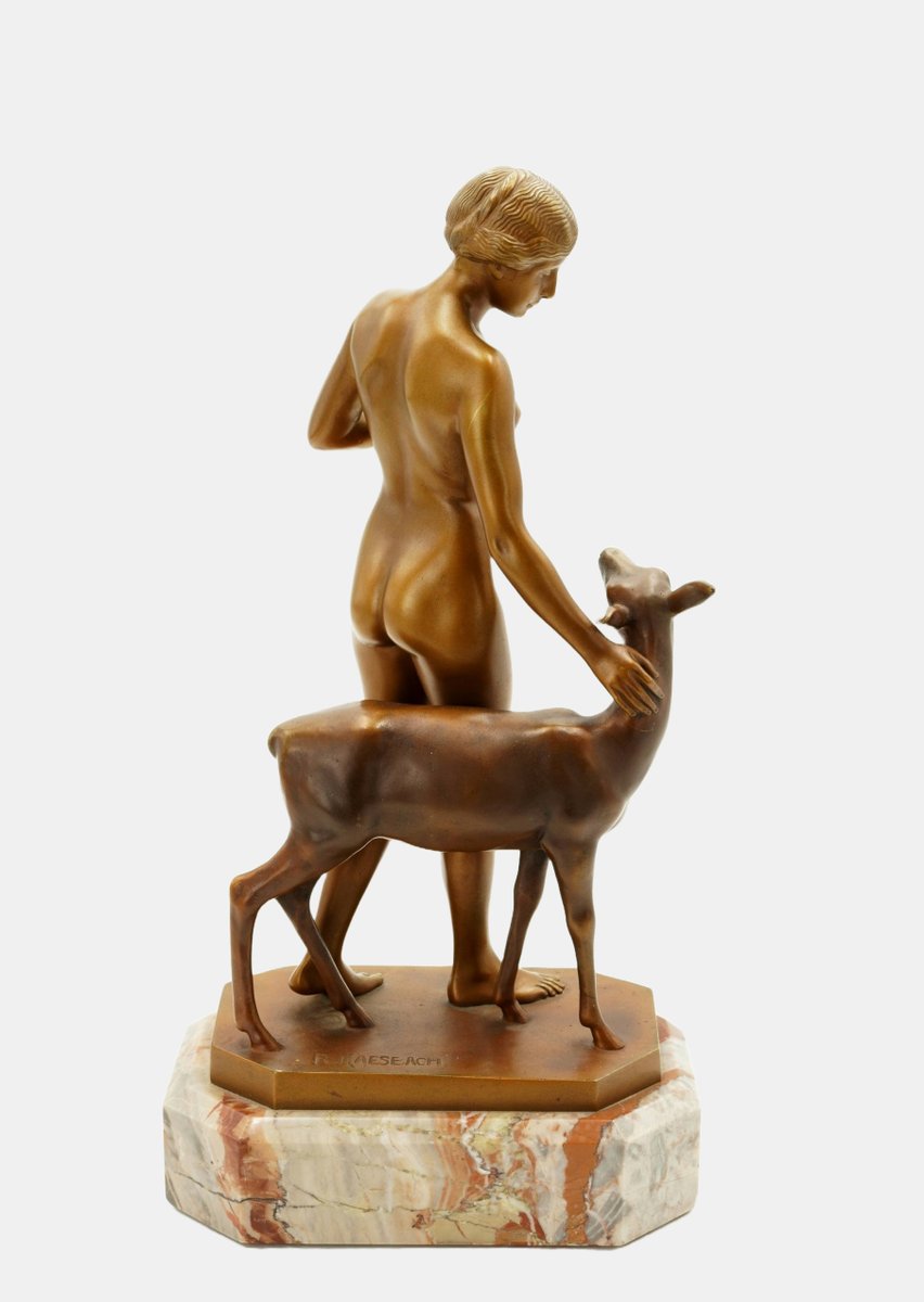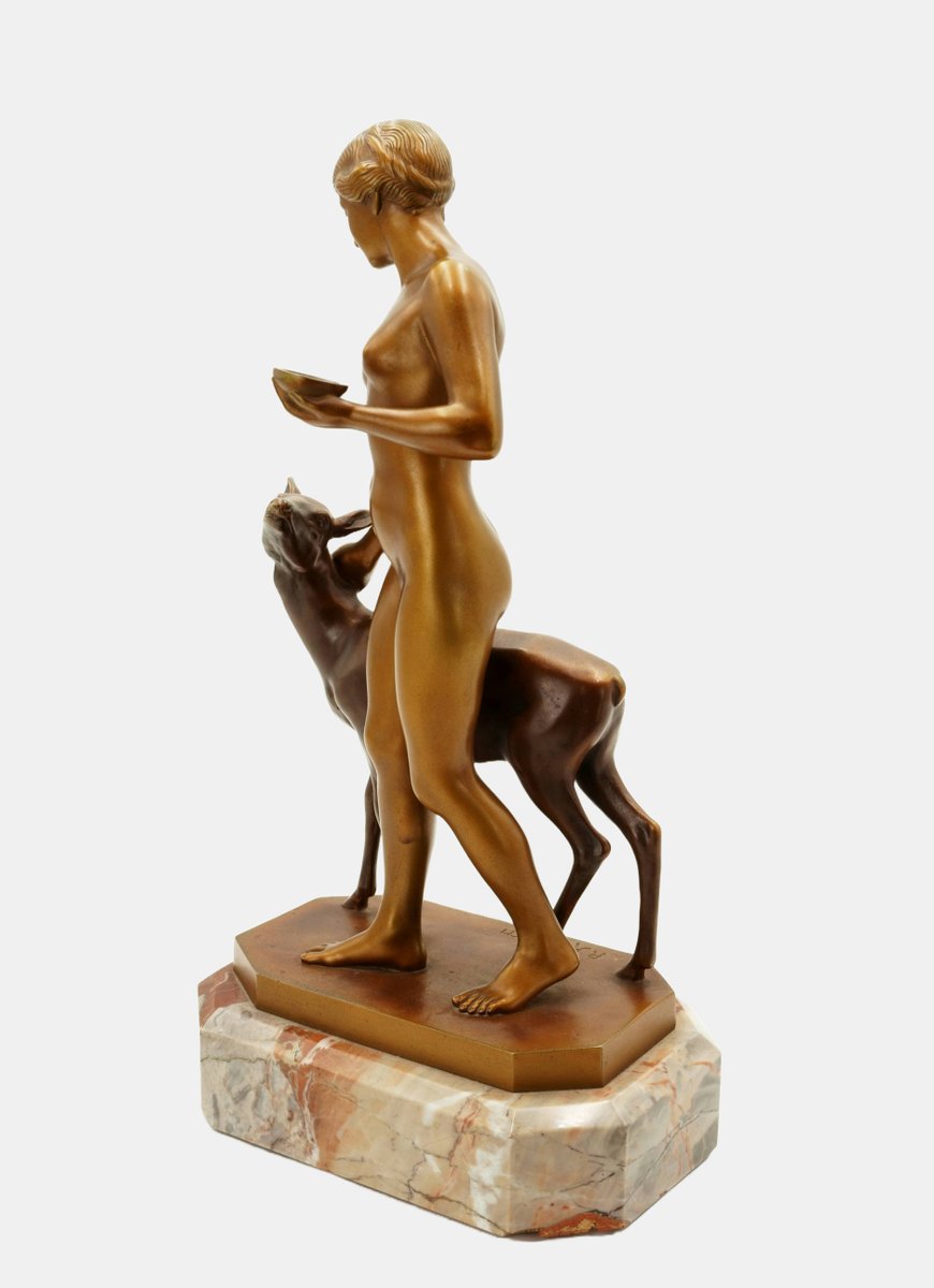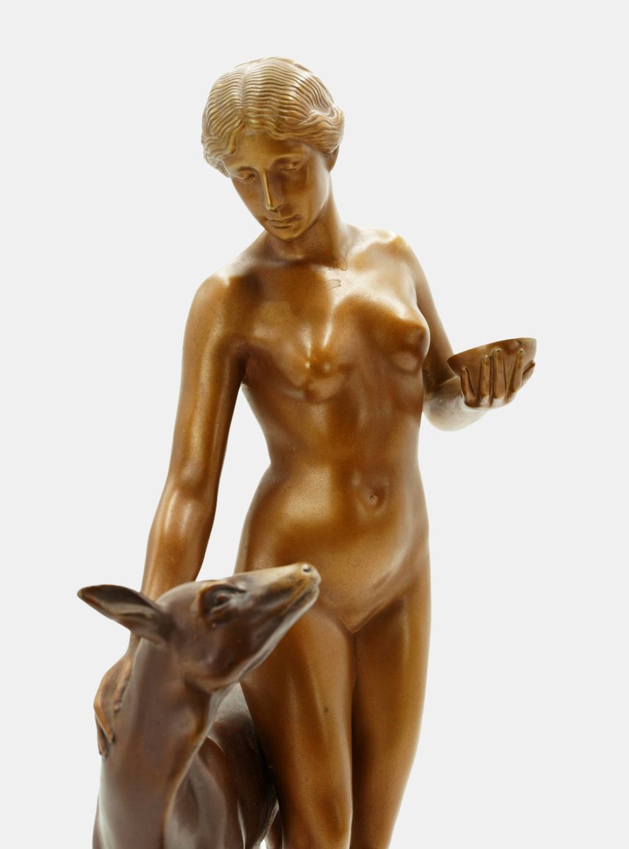 Die im Kontrast zur naturalistischeren Einfärbung des Rehs aufstrahlende goldfarbene Patina lässt die junge Frau wie eine Heilige erscheinen, auch wenn sich nicht als Heilige identifizierbar ist. Zugleich ruft sie Erinnerungen an die Jagdgöttin Diana oder eine Nymphe hervor. Dafür fehlt ihr allerdings die Wildheit. In ihrer unschuldigen Naivität gemahnt sie vielmehr an eine Vestalin, die freilich nicht in der Waldeinsamkeit zu Hause ist. Und doch wirkt die sich unbekleidet im Herzen der Natur bewegende junge Schönheit wie eine Priesterin, die sich mit hochgebundenem Haar und der vorsichtig getragenen Schale und dem Wege zu einem Heiligen Hain befindet.