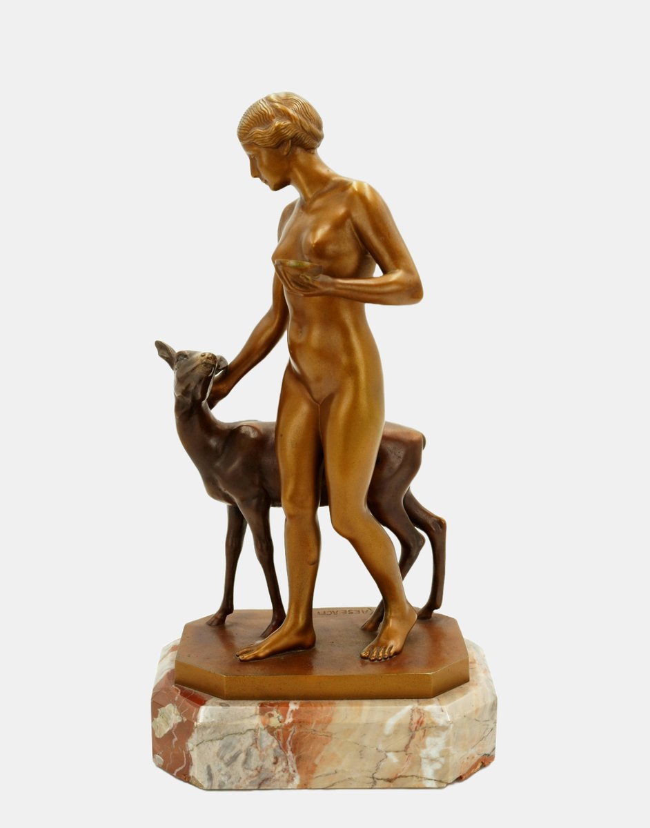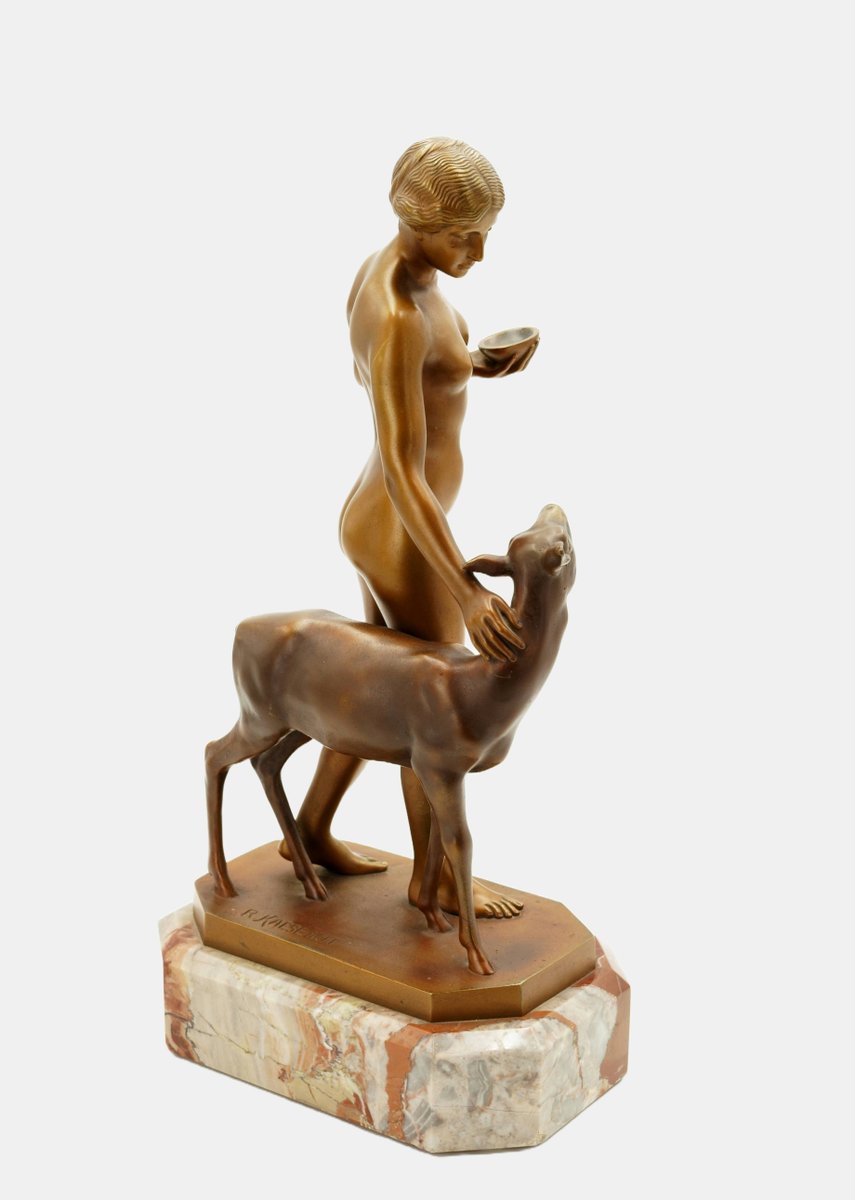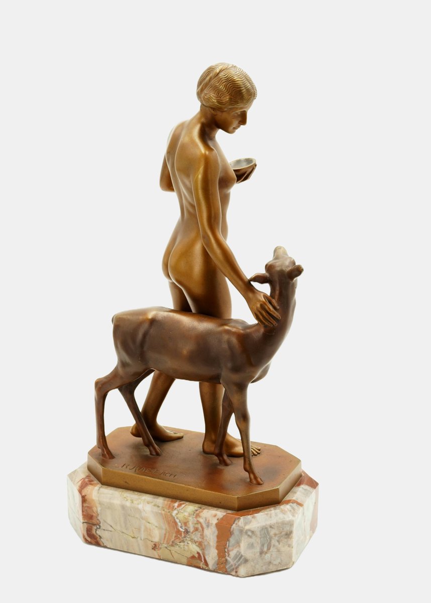 Die im Kontrast zur naturalistischeren Einfärbung des Rehs aufstrahlende goldfarbene Patina lässt die junge Frau wie eine Heilige erscheinen, auch wenn sich nicht als Heilige identifizierbar ist. Zugleich ruft sie Erinnerungen an die Jagdgöttin Diana oder eine Nymphe hervor. Dafür fehlt ihr allerdings die Wildheit. In ihrer unschuldigen Naivität gemahnt sie vielmehr an eine Vestalin, die freilich nicht in der Waldeinsamkeit zu Hause ist. Und doch wirkt die sich unbekleidet im Herzen der Natur bewegende junge Schönheit wie eine Priesterin, die sich mit hochgebundenem Haar und der vorsichtig getragenen Schale und dem Wege zu einem Heiligen Hain befindet.