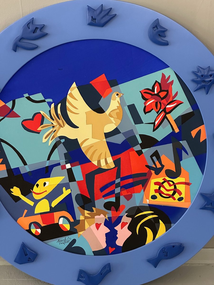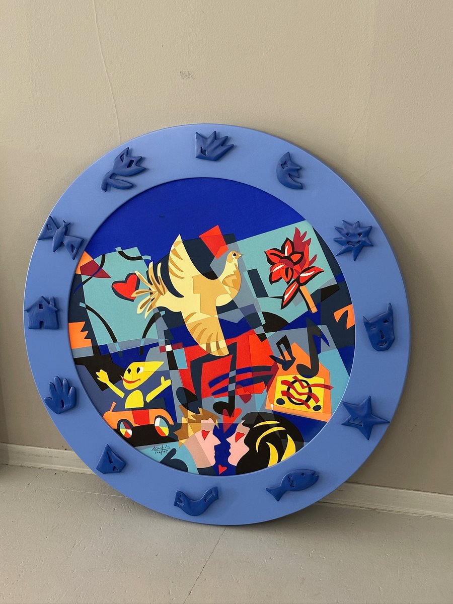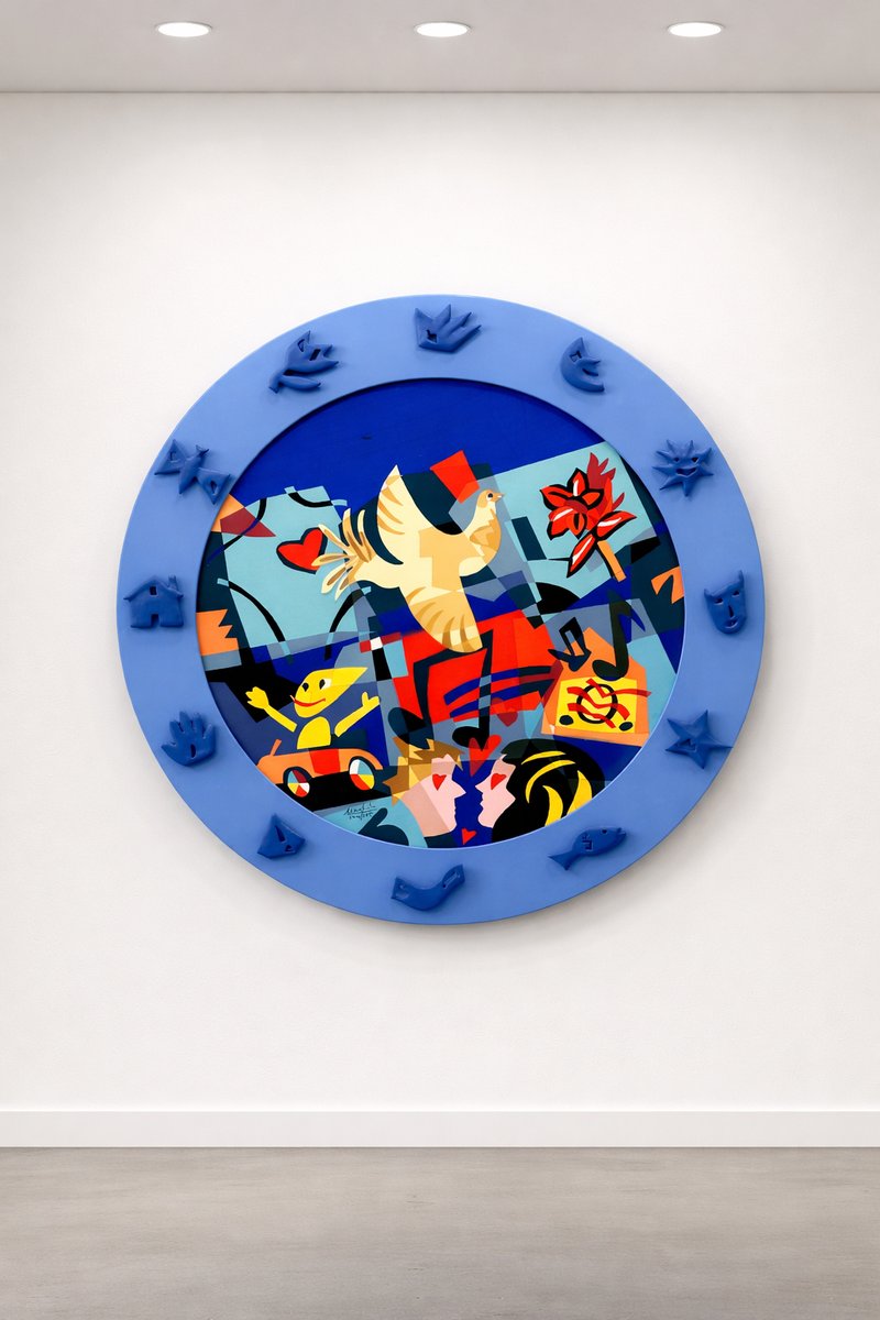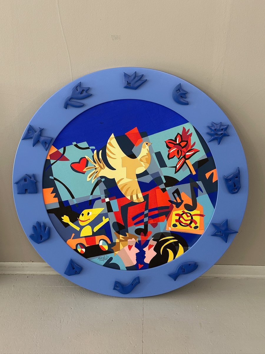 Titel: „A World of Peace”, Mischtechnik und Collage auf gerahmter Platte, Multiple (175/195). Die zentrale Komposition wird durch stilisierte Figuren, musikalische Symbole, Naturelemente und Bezüge zur Kindheit und Fantasie belebt und schafft so ein dynamisches und fröhliches Gesamtbild. Der dreidimensionale blaue Rahmen, der durch geprägte Symbole am Rand bereichert wird, verleiht dem Werk eine starke skulpturale Präsenz und eine unmittelbare visuelle Wirkung.