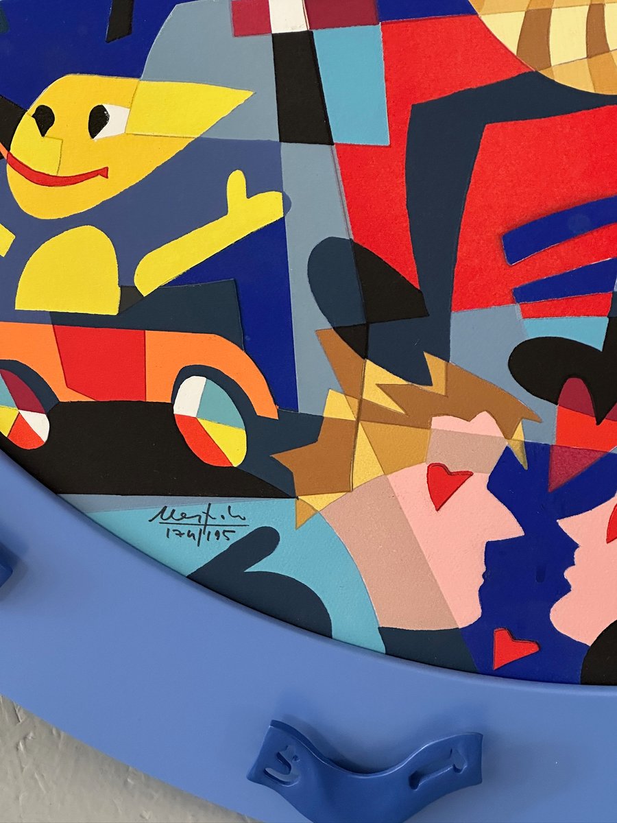 A circular artwork by Ugo Nespolo, one of the leading figures of contemporary Italian art. The work stands out for its use of vibrant colors, geometric shapes, and iconic symbols, typical elements of the artist's visual language, which blends Pop Art, design, and storytelling.