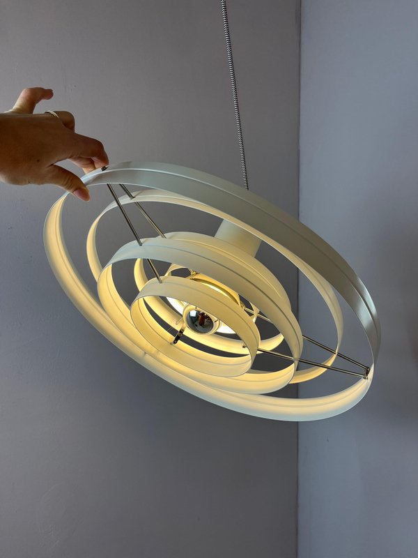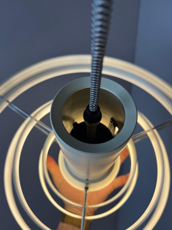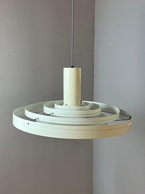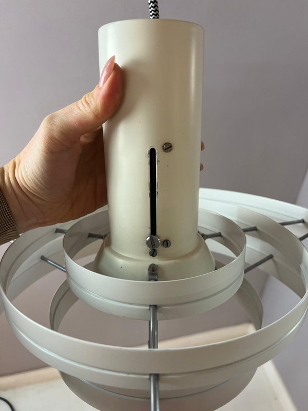 The Fibonacci pendant lamp is an absolute masterpiece of Danish lighting design. Designed in 1964 by architect Sophus Frandsen for the renowned manufacturer Fog & Mørup, it was among the most exclusive and expensive models in the range during the 1960s and received numerous awards, including a gold medal at the Leipzig Trade Fair. The construction of white metal rings is exceptionally delicate, creating a light and airy appearance. The ingenious design guarantees even, diffused illumination that remains glare-free in all directions. A particularly functional detail is the sliding mechanism that allows the central element to be adjusted in height. Originally, this model featured an additional funnel at the bottom. As with most surviving Fibonacci lamps, this is no longer present, a feature often preferred today as it allows for further light diffusion. This impressive light fixture was traditionally found in the entrance halls of Danish schools and public buildings.
