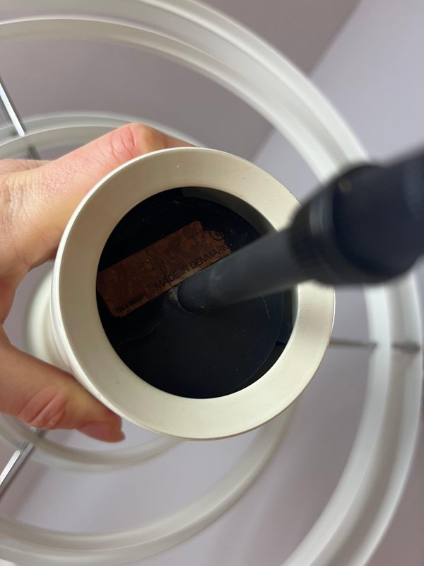 Die Fibonacci Pendelleuchte ist ein absolutes Meisterstück des dänischen Lichtdesigns. Entworfen wurde sie 1964 von dem Architekten Sophus Frandsen für den renommierten Hersteller Fog & Mørup. In den 1960er Jahren zählte sie zu den exklusivsten und teuersten Modellen des Sortiments und wurde vielfach ausgezeichnet, unter anderem mit einer Goldmedaille auf der Leipziger Messe. Die Konstruktion aus weißen Metallringen ist äußerst filigran und sorgt für ein leichtes, luftiges Erscheinungsbild. Das durchdachte Konzept garantiert eine gleichmäßige, diffuse Beleuchtung, die in alle Richtungen blendfrei bleibt. Ein besonderes funktionales Detail ist der Schiebemechanismus, mit dem das mittlere Element in der Höhe verstellt werden kann. Dadurch lässt sich der Abstand zum Leuchtmittel variieren, um die Lichtwirkung und Leuchtkraft individuell anzupassen. Ursprünglich verfügte dieses Modell über einen zusätzlichen Trichter an der Unterseite. Wie bei den meisten erhaltenen Fibonacci-Leuchten ist dieser hier nicht mehr vorhanden, was heute oft bevorzugt wird, da es eine weitere Lichtstreuung ermöglicht. Klassischerweise fand man diese imposante Leuchte in den Eingangshallen dänischer Schulen und öffentlicher Gebäude.