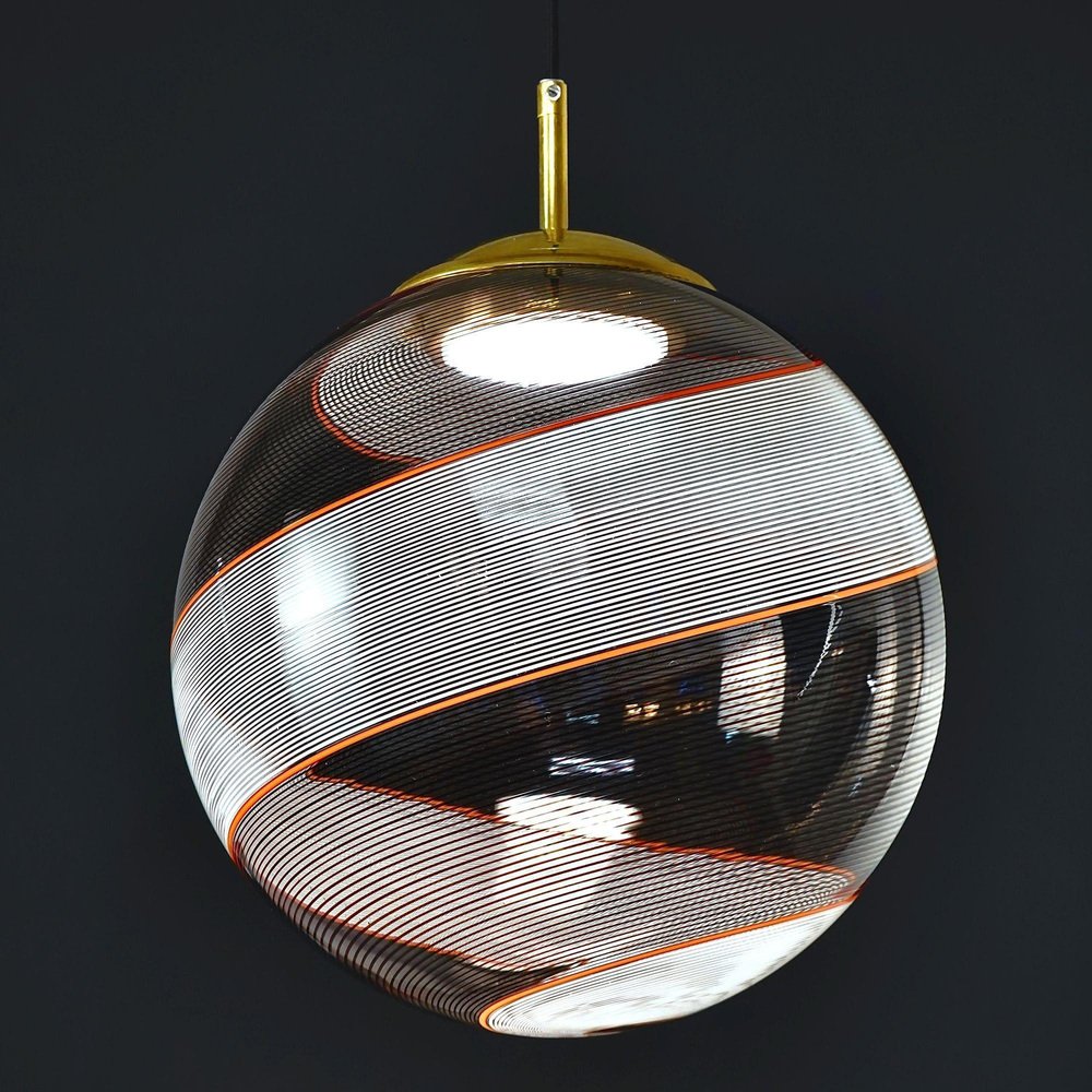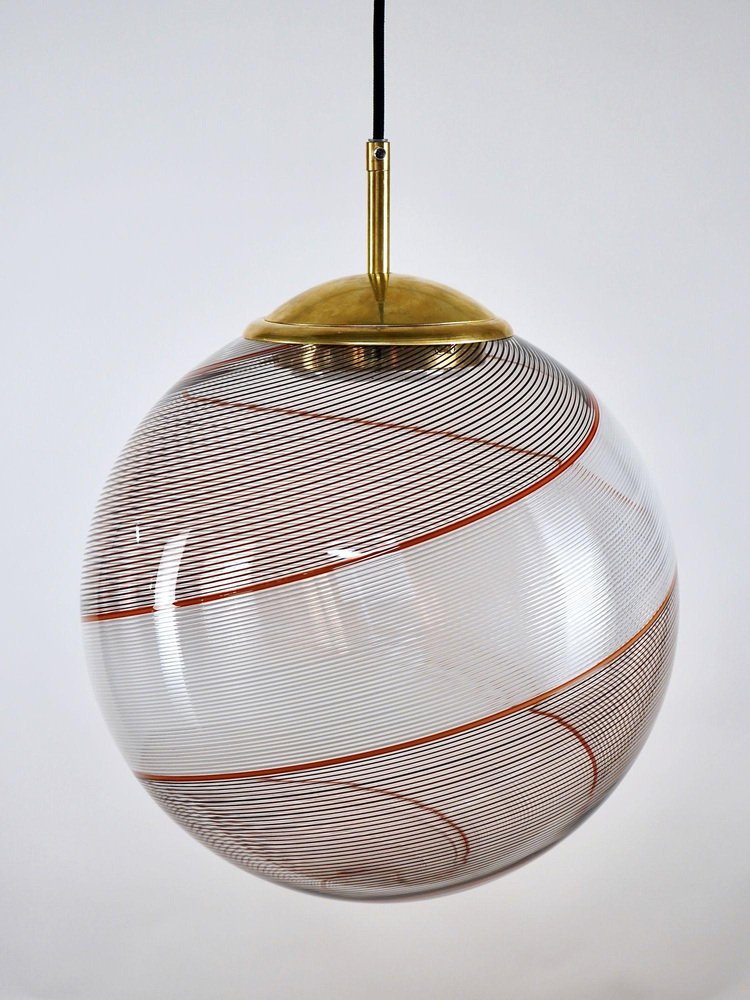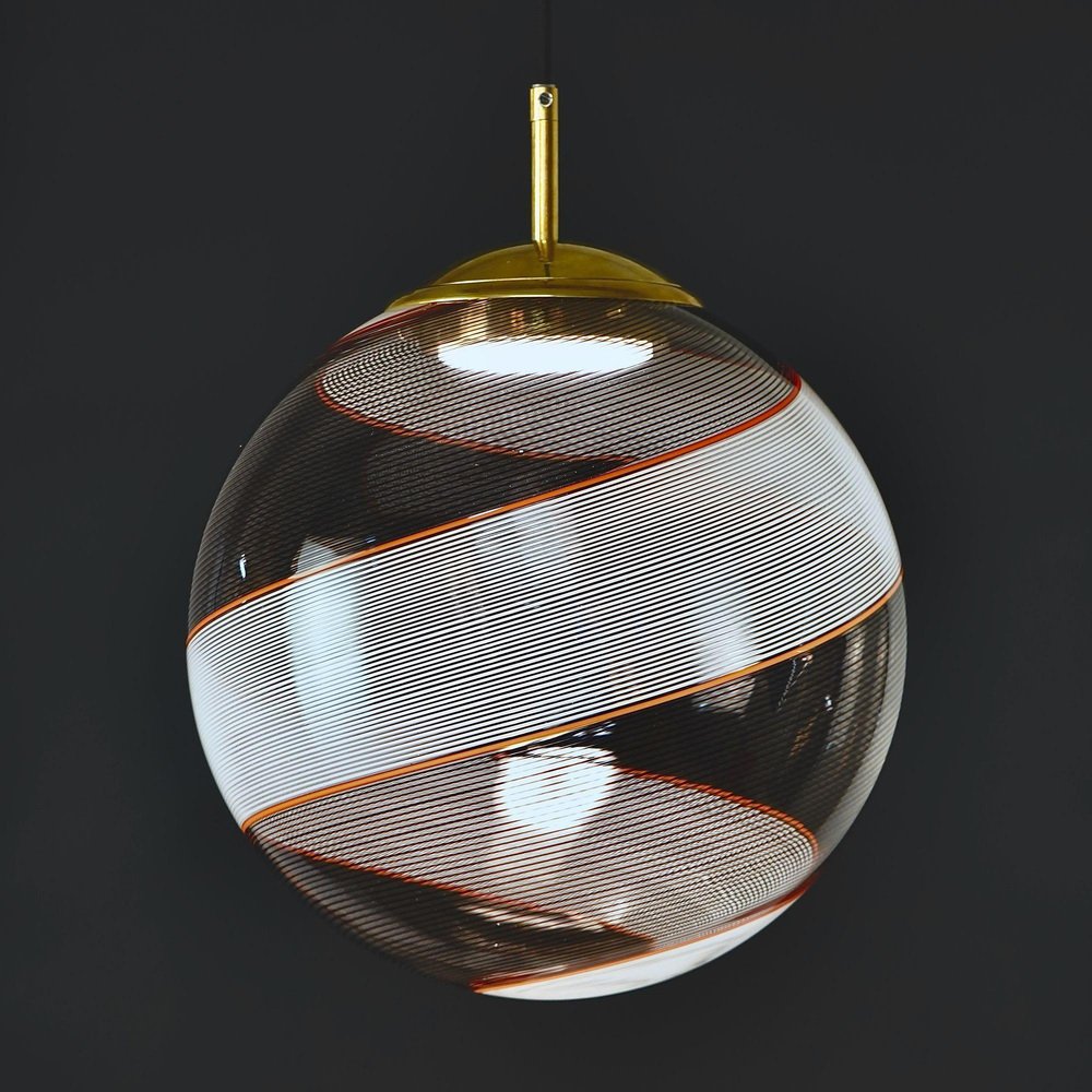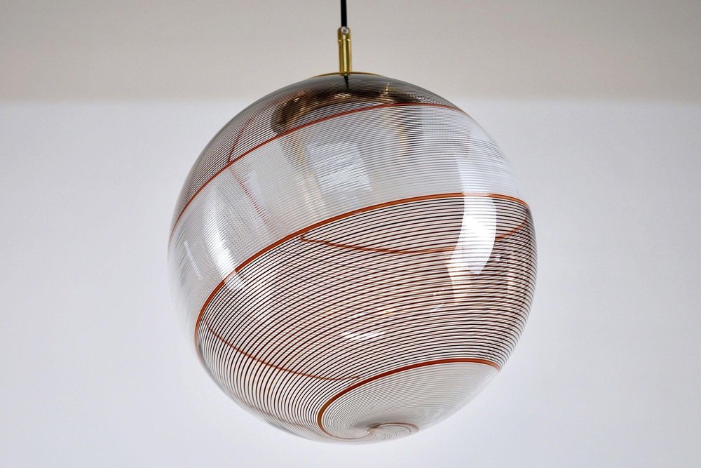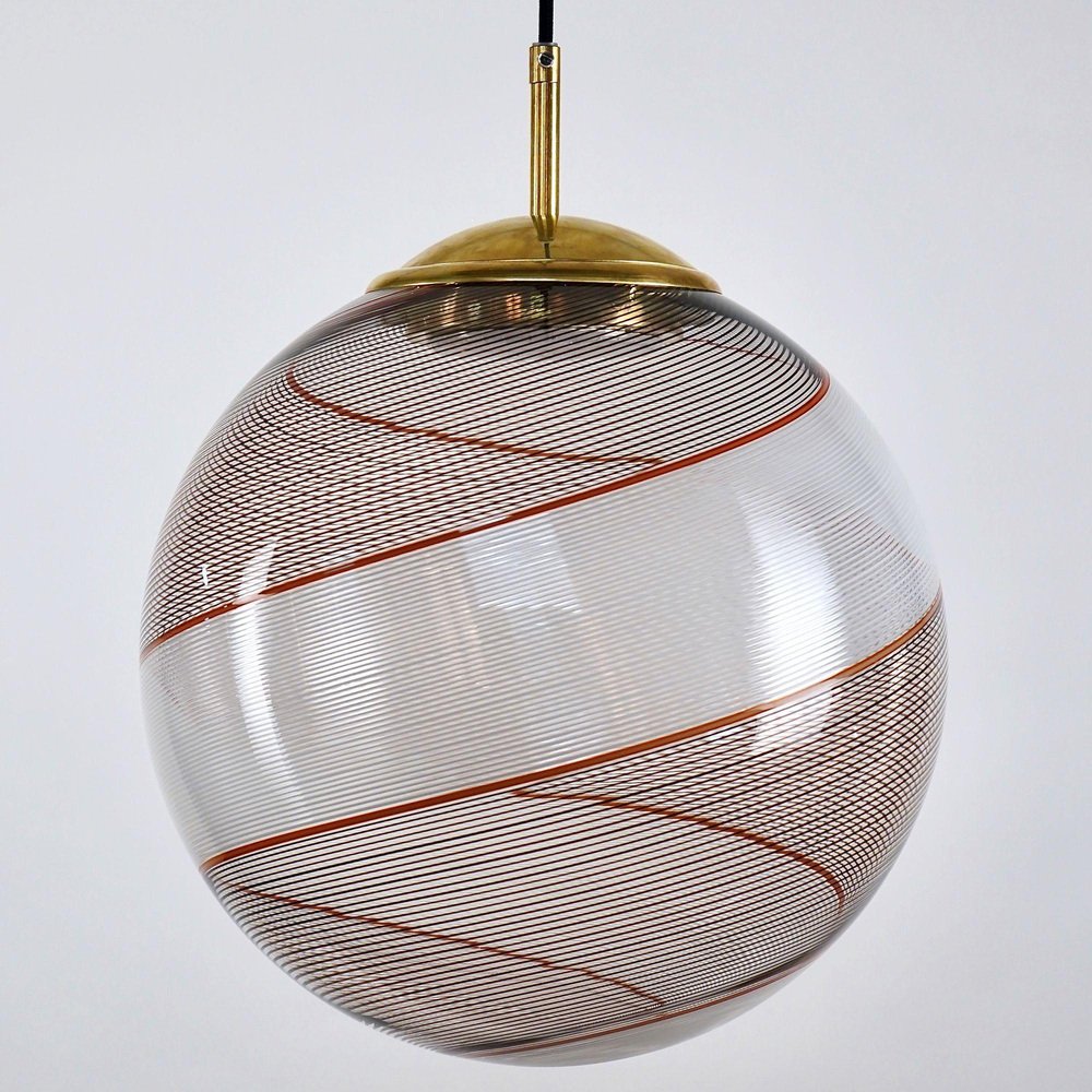 Die Gaia-Kollektion stellt eine zeitgenössische Version der Beleuchtung dar und zeigt Glaskugeln, die der klassischen Murano Mezza Filigrana-Technik aus der Mitte des Jahrhunderts neues Leben einhauchen. Sie bietet Vielseitigkeit und ermöglicht es Ihnen, Muster zu mischen und zu kombinieren oder ein einzelnes Design auszuwählen, um eine persönliche Ästhetik zu schaffen. Die fast verlorene Kunst der Mezza Filigrana wurde durch individuell gestaltete Beschläge wiederbelebt. Ich habe neun einzigartige Muster aus Murano-Filigrana in Farben wie Lattimo-Weiß, Schwarz, Bernstein und Rot kreiert. Jede Glaskugel hat einen Durchmesser von 35 cm (14 Zoll) und ist mit eleganten, modernen Beschlägen versehen, die einen klaren und ungehinderten Blick auf das Design ermöglichen. Sie eignen sich perfekt für eine Anordnung über einem Essbereich, über einer Kochinsel oder als auffälliges Element in einem Treppenhaus. Diese besondere Version zeigt zwei verdrehte Filigranteile, eines in Schwarz und eines in Weiß, eingerahmt von einem einzelnen roten Filigrana-Streifen. Sie ist inspiriert von Dino Martens' meisterhaften Schwarz-Weiß-Kontrasten, die durch ein einzelnes Filigrana-Stäbchen, in der Regel Avventurina, akzentuiert werden. Das Ergebnis ist visuell fesselnd - ein Design, das den Betrachter in seinen Bann zieht und ihn zu einem genaueren Blick verleitet. In Zusammenarbeit mit einem Murano-Meister überwachte ich zwei vollständige Ritorto-Drehungen (im Murano-Dialekt "menà" genannt), bei denen ein dichtes, kreuz und quer verlaufendes Mosaik aus über 70 Stöcken entstand. Das Gaia-Muster entsteht durch das Rollen von Glas über ein Mosaik aus Murano-Smalto-Filigran. Das Glas wird zweimal geschleudert, bevor es geblasen wird, wodurch die Spiralen aus den Stäben entstehen. In den massiven Messingbeschlägen befindet sich ein in Italien hergestelltes LED-Modul, das 1000 Lumen liefert, dimmbar ist und einen CRI von über 90 für eine präzise Farbwiedergabe hat. Das Design bleibt vollständig sichtbar, ohne zentrale Fassung oder Glühbirne. Das schwarze Seidenkabel und der UL-CE SELV-Treiber sind nahtlos in den Messingbaldachin integriert und sorgen für einen sauberen, polierten Look.
