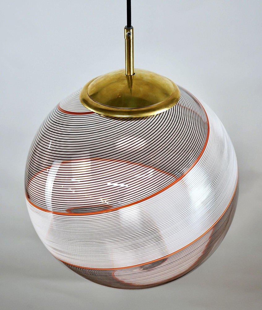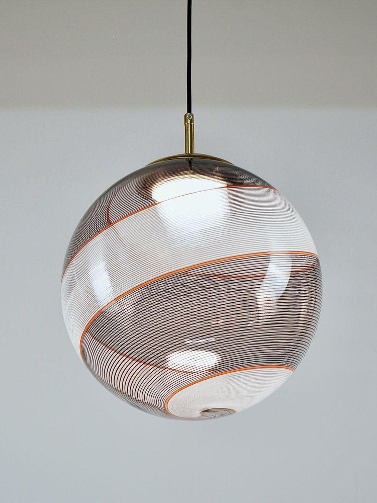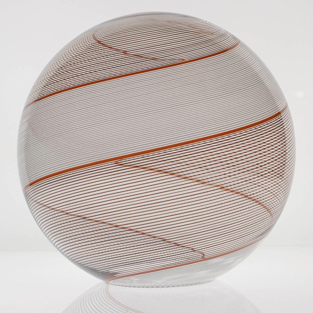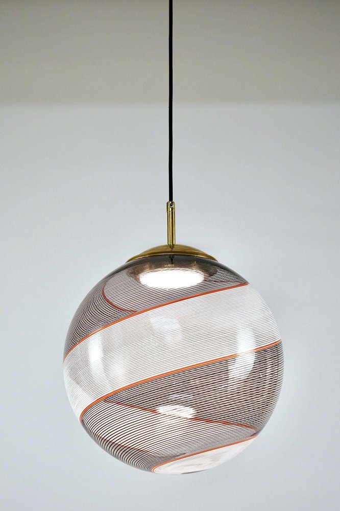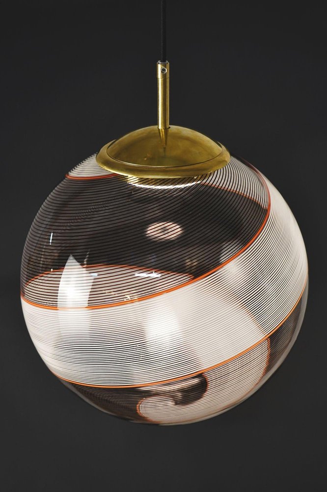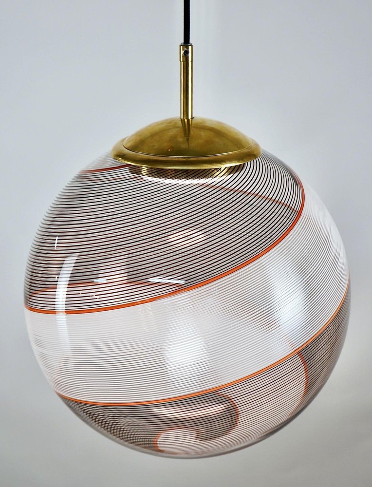 Die Gaia-Kollektion stellt eine zeitgenössische Version der Beleuchtung dar und zeigt Glaskugeln, die der klassischen Murano Mezza Filigrana-Technik aus der Mitte des Jahrhunderts neues Leben einhauchen. Sie bietet Vielseitigkeit und ermöglicht es Ihnen, Muster zu mischen und zu kombinieren oder ein einzelnes Design auszuwählen, um eine persönliche Ästhetik zu schaffen. Die fast verlorene Kunst der Mezza Filigrana wurde durch individuell gestaltete Beschläge wiederbelebt. Ich habe neun einzigartige Muster aus Murano-Filigrana in Farben wie Lattimo-Weiß, Schwarz, Bernstein und Rot kreiert. Jede Glaskugel hat einen Durchmesser von 35 cm (14 Zoll) und ist mit eleganten, modernen Beschlägen versehen, die einen klaren und ungehinderten Blick auf das Design ermöglichen. Sie eignen sich perfekt für eine Anordnung über einem Essbereich, über einer Kochinsel oder als auffälliges Element in einem Treppenhaus. Diese besondere Version zeigt zwei verdrehte Filigranteile, eines in Schwarz und eines in Weiß, eingerahmt von einem einzelnen roten Filigrana-Streifen. Sie ist inspiriert von Dino Martens' meisterhaften Schwarz-Weiß-Kontrasten, die durch ein einzelnes Filigrana-Stäbchen, in der Regel Avventurina, akzentuiert werden. Das Ergebnis ist visuell fesselnd - ein Design, das den Betrachter in seinen Bann zieht und ihn zu einem genaueren Blick verleitet. In Zusammenarbeit mit einem Murano-Meister überwachte ich zwei vollständige Ritorto-Drehungen (im Murano-Dialekt "menà" genannt), bei denen ein dichtes, kreuz und quer verlaufendes Mosaik aus über 70 Stöcken entstand. Das Gaia-Muster entsteht durch das Rollen von Glas über ein Mosaik aus Murano-Smalto-Filigran. Das Glas wird zweimal geschleudert, bevor es geblasen wird, wodurch die Spiralen aus den Stäben entstehen. In den massiven Messingbeschlägen befindet sich ein in Italien hergestelltes LED-Modul, das 1000 Lumen liefert, dimmbar ist und einen CRI von über 90 für eine präzise Farbwiedergabe hat. Das Design bleibt vollständig sichtbar, ohne zentrale Fassung oder Glühbirne. Das schwarze Seidenkabel und der UL-CE SELV-Treiber sind nahtlos in den Messingbaldachin integriert und sorgen für einen sauberen, polierten Look.