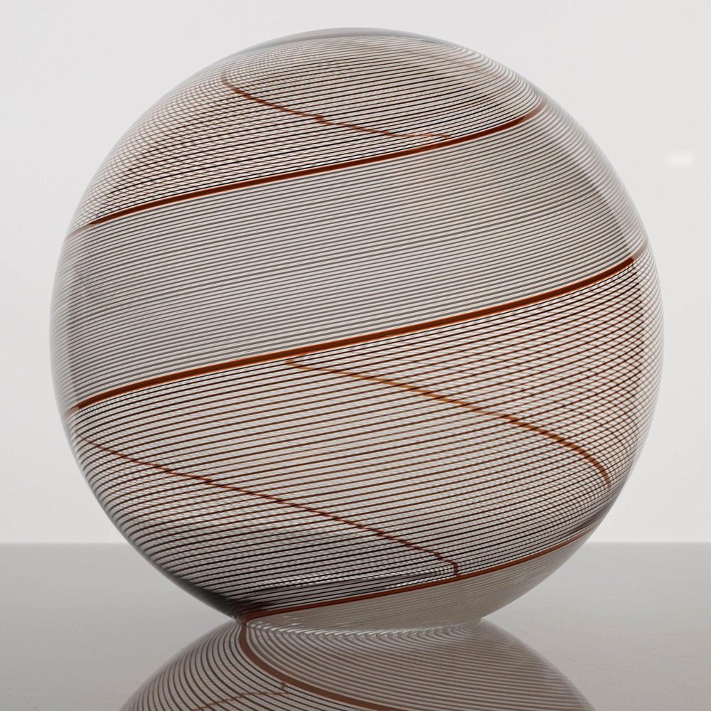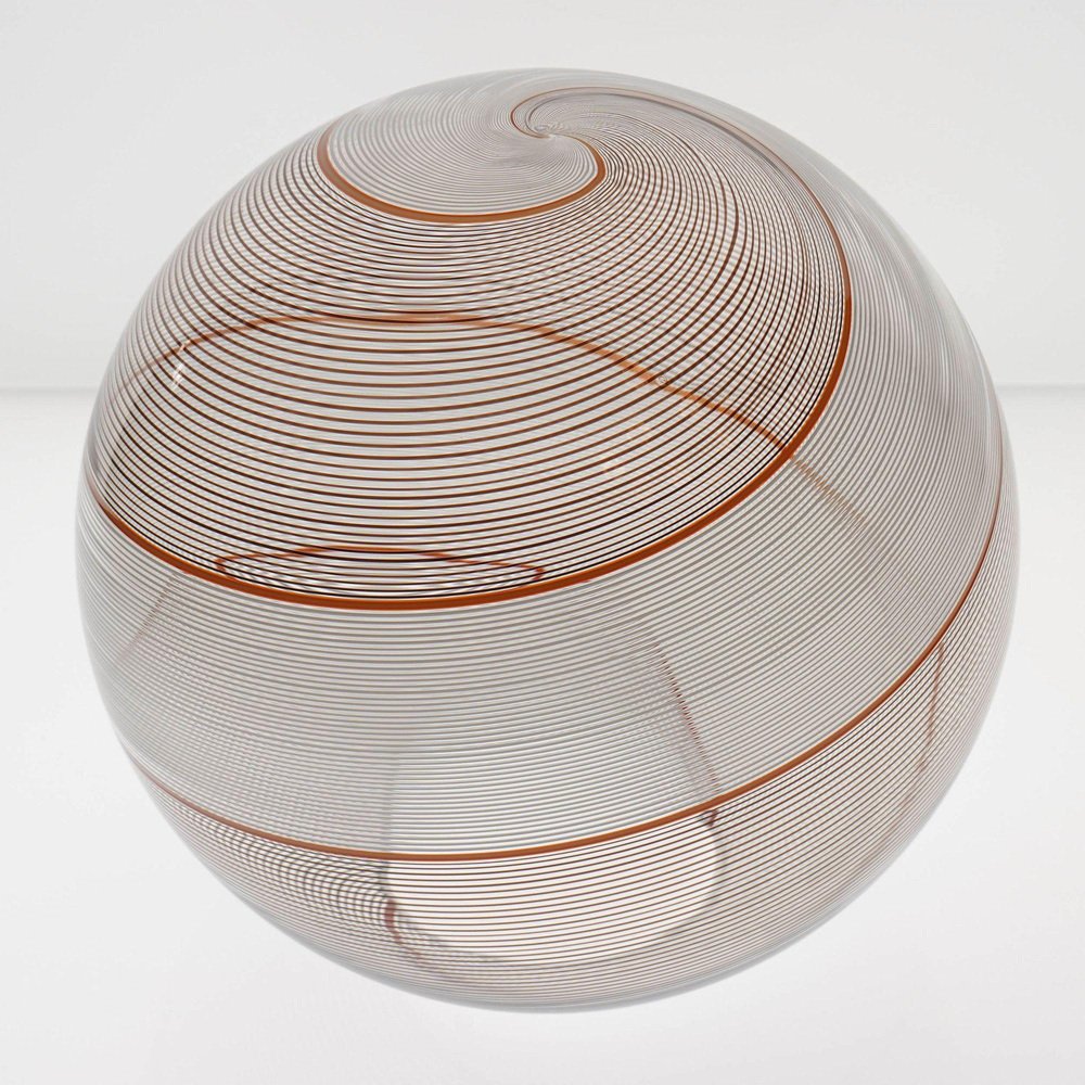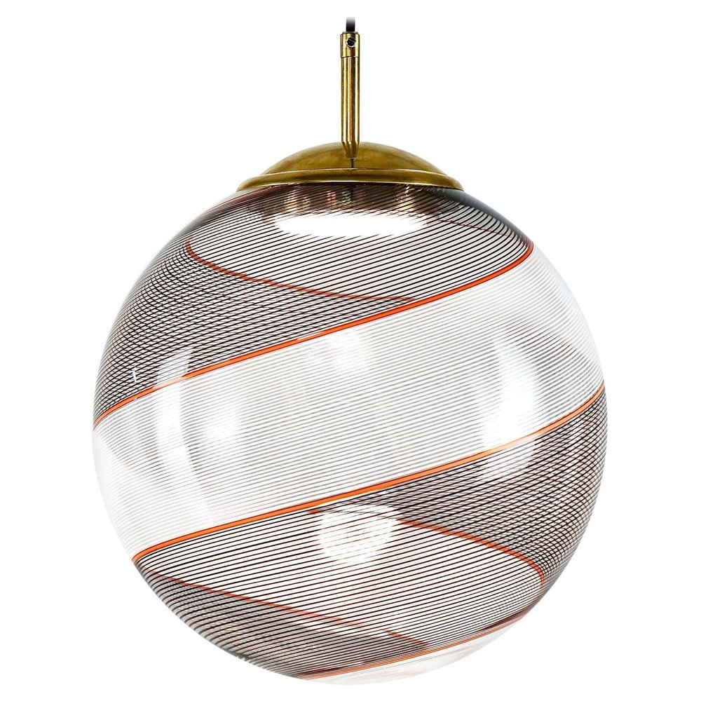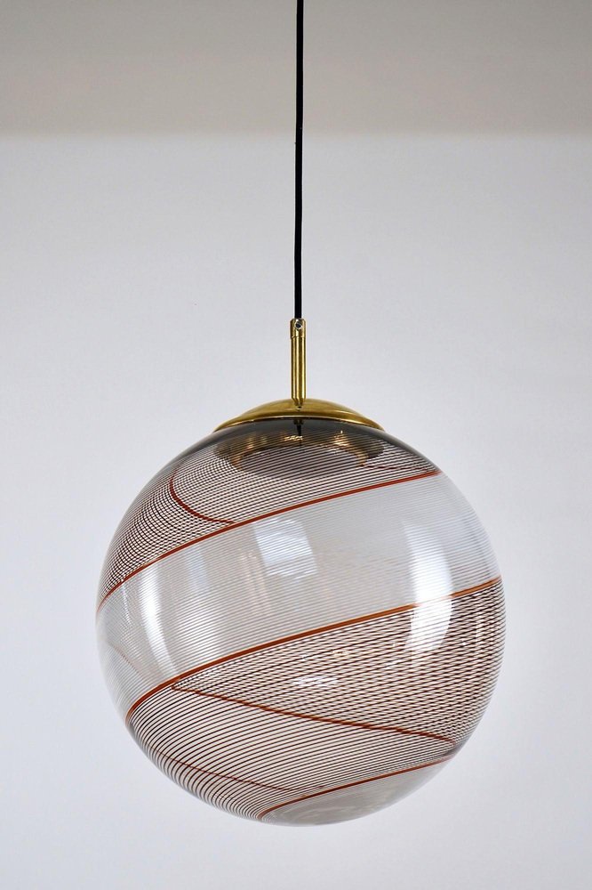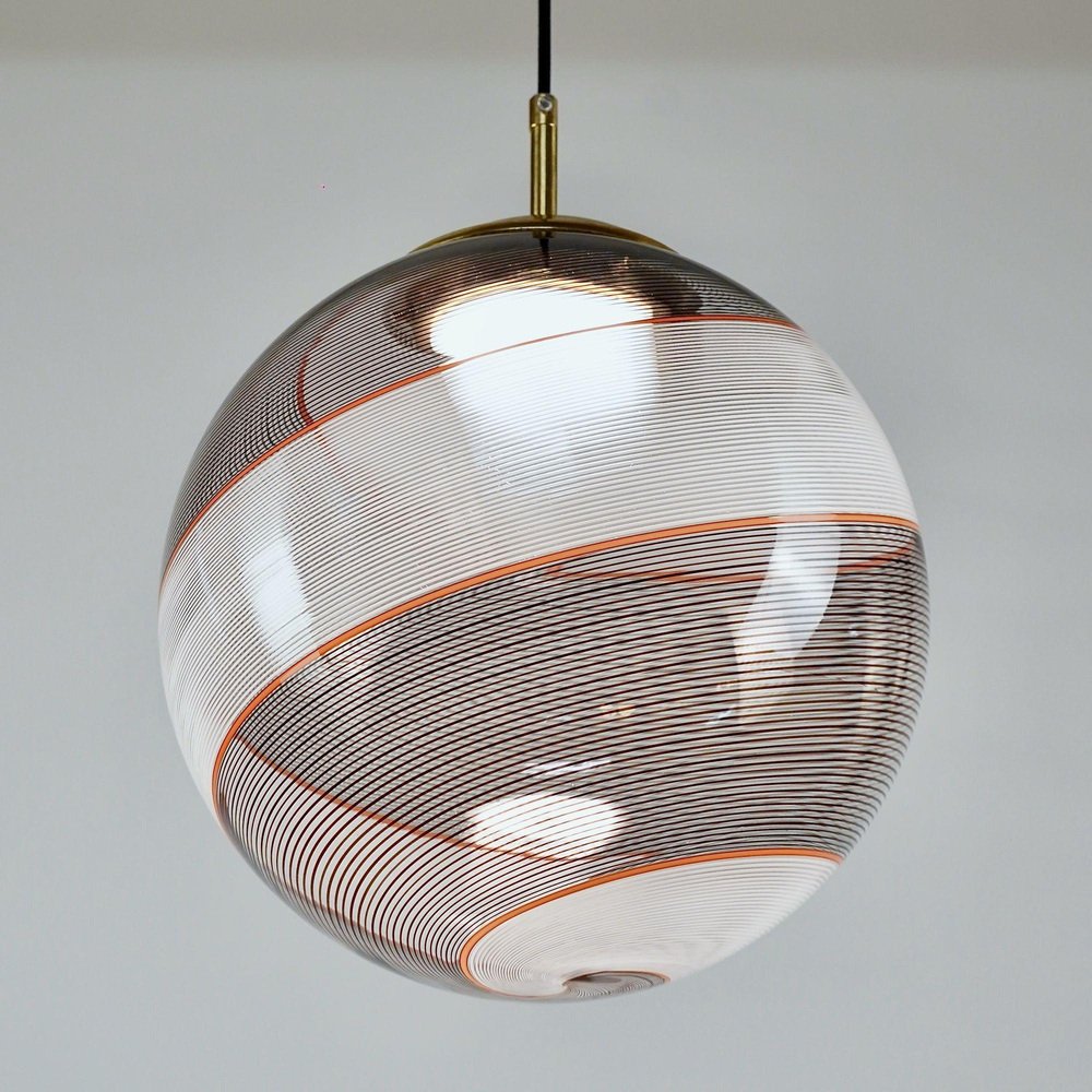 Die Gaia-Kollektion stellt eine zeitgenössische Version der Beleuchtung dar und zeigt Glaskugeln, die der klassischen Murano Mezza Filigrana-Technik aus der Mitte des Jahrhunderts neues Leben einhauchen. Sie bietet Vielseitigkeit und ermöglicht es Ihnen, Muster zu mischen und zu kombinieren oder ein einzelnes Design auszuwählen, um eine persönliche Ästhetik zu schaffen. Die fast verlorene Kunst der Mezza Filigrana wurde durch individuell gestaltete Beschläge wiederbelebt. Ich habe neun einzigartige Muster aus Murano-Filigrana in Farben wie Lattimo-Weiß, Schwarz, Bernstein und Rot kreiert. Jede Glaskugel hat einen Durchmesser von 35 cm (14 Zoll) und ist mit eleganten, modernen Beschlägen versehen, die einen klaren und ungehinderten Blick auf das Design ermöglichen. Sie eignen sich perfekt für eine Anordnung über einem Essbereich, über einer Kochinsel oder als auffälliges Element in einem Treppenhaus. Diese besondere Version zeigt zwei verdrehte Filigranteile, eines in Schwarz und eines in Weiß, eingerahmt von einem einzelnen roten Filigrana-Streifen. Sie ist inspiriert von Dino Martens' meisterhaften Schwarz-Weiß-Kontrasten, die durch ein einzelnes Filigrana-Stäbchen, in der Regel Avventurina, akzentuiert werden. Das Ergebnis ist visuell fesselnd - ein Design, das den Betrachter in seinen Bann zieht und ihn zu einem genaueren Blick verleitet. In Zusammenarbeit mit einem Murano-Meister überwachte ich zwei vollständige Ritorto-Drehungen (im Murano-Dialekt "menà" genannt), bei denen ein dichtes, kreuz und quer verlaufendes Mosaik aus über 70 Stöcken entstand. Das Gaia-Muster entsteht durch das Rollen von Glas über ein Mosaik aus Murano-Smalto-Filigran. Das Glas wird zweimal geschleudert, bevor es geblasen wird, wodurch die Spiralen aus den Stäben entstehen. In den massiven Messingbeschlägen befindet sich ein in Italien hergestelltes LED-Modul, das 1000 Lumen liefert, dimmbar ist und einen CRI von über 90 für eine präzise Farbwiedergabe hat. Das Design bleibt vollständig sichtbar, ohne zentrale Fassung oder Glühbirne. Das schwarze Seidenkabel und der UL-CE SELV-Treiber sind nahtlos in den Messingbaldachin integriert und sorgen für einen sauberen, polierten Look.