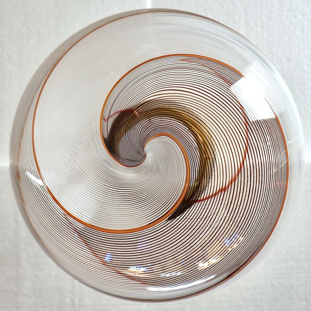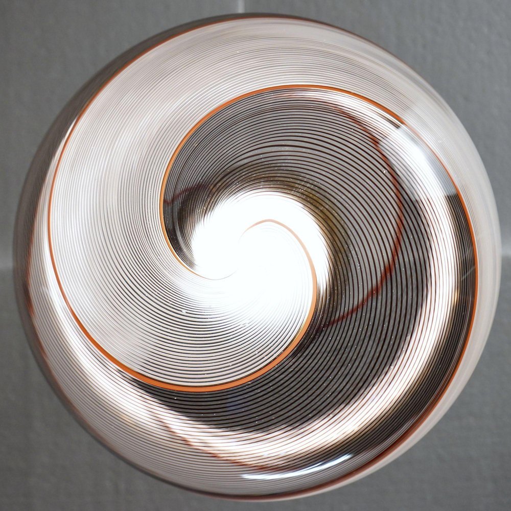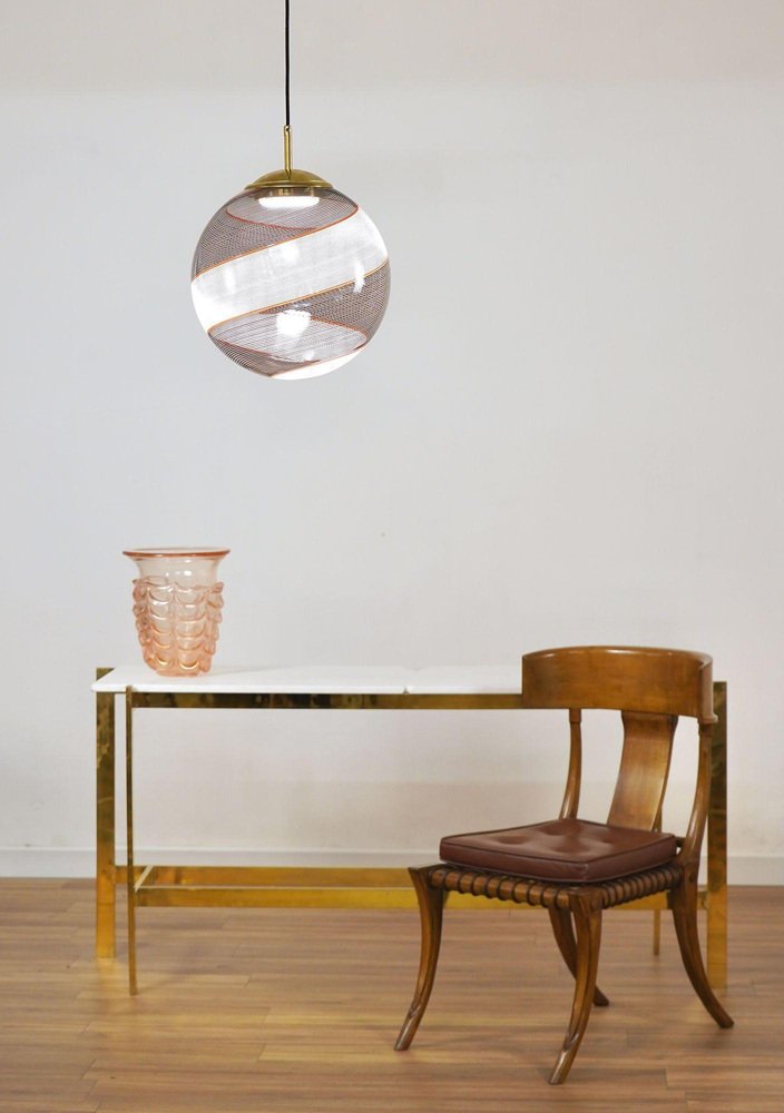 The Gaia collection introduces a contemporary take on lighting, showcasing glass spheres that breathe new life into the classic Mid-century Murano Mezza Filigrana technique. It provides versatility, allowing you to mix and match patterns or select a single design to create a personalized aesthetic. The nearly lost art of Mezza Filigrana has been revived through custom-designed hardware. I’ve crafted nine unique patterns using Murano filigrana in colors like Lattimo white, Black, Amber, and Red. Each glass sphere has a 35 cm (14 inches) diameter and is paired with sleek, contemporary hardware that allows for a clear and unobstructed view of the design. Perfect for clustering above a dining area, hanging above an island, or as a striking feature in a stairwell. This particular version showcases two twisted Filigree sections, one in Black and one in White, framed by a single red Filigrana stripe. It draws inspiration from Dino Martens’ mastery of contrasting black and white, with a distinctive outline accentuated by a single Filigrana cane, usually Avventurina. The result is visually captivating—a design that mesmerizes you, pulling you in for a closer look. In collaboration with a Murano maestro, I oversaw two full ritorto stretching spins (known as "menà" in Murano dialect), crafting a dense, criss-crossed mosaic of over 70 canes. The Gaia pattern is formed by rolling glass over a mosaic of Murano smalto filigree. The glass is spun twice before being blown, creating spirals from the canes. The solid brass hardware is home to an Italian-made LED module that delivers 1000 lumens, is dimmable, and has a CRI of over 90 for precise color rendering. The design remains fully visible with no central socket or bulb. The black silk wire and UL-CE SELV driver are seamlessly integrated into the brass canopy for a clean, polished look.