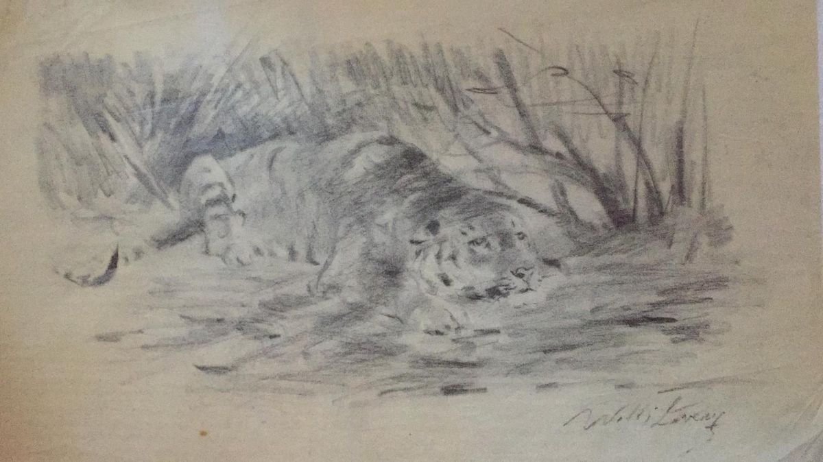 Tiger at rest is a beautiful original drawing on sketch paper realized in the XX century by the German artist Wilhelm Lorenz, also known as Willi Lorenz. This is a preparatory study representing a tiger at rest, made with fresh lines and a sure touch. This modern artwork is in very good condition. Hand signed on the lower right side of the drawing W.L.. Wilhelm Lorenz (Germany, 1901–1981), also known as Willi Lorenz, was a German painter specialized in paintings of animals typically hunted as a game. His highly detailed oil paintings evoke the texture and movement of animals like boars, foxes, buffalos, and lions, depicted in their natural habitats and attitudes. His artworks resemble the works by Max Josef Hänger Lorenz. Willi Lorenz attended the Düsseldorf Academy of Art before moving to Cologne to start his artistic career.