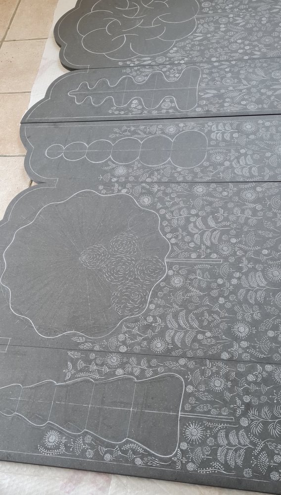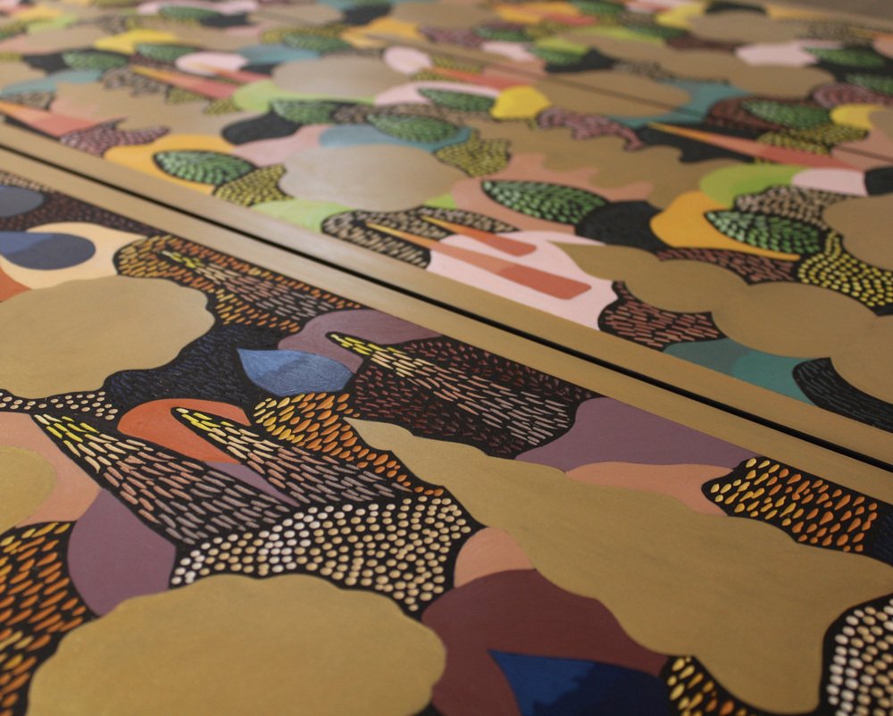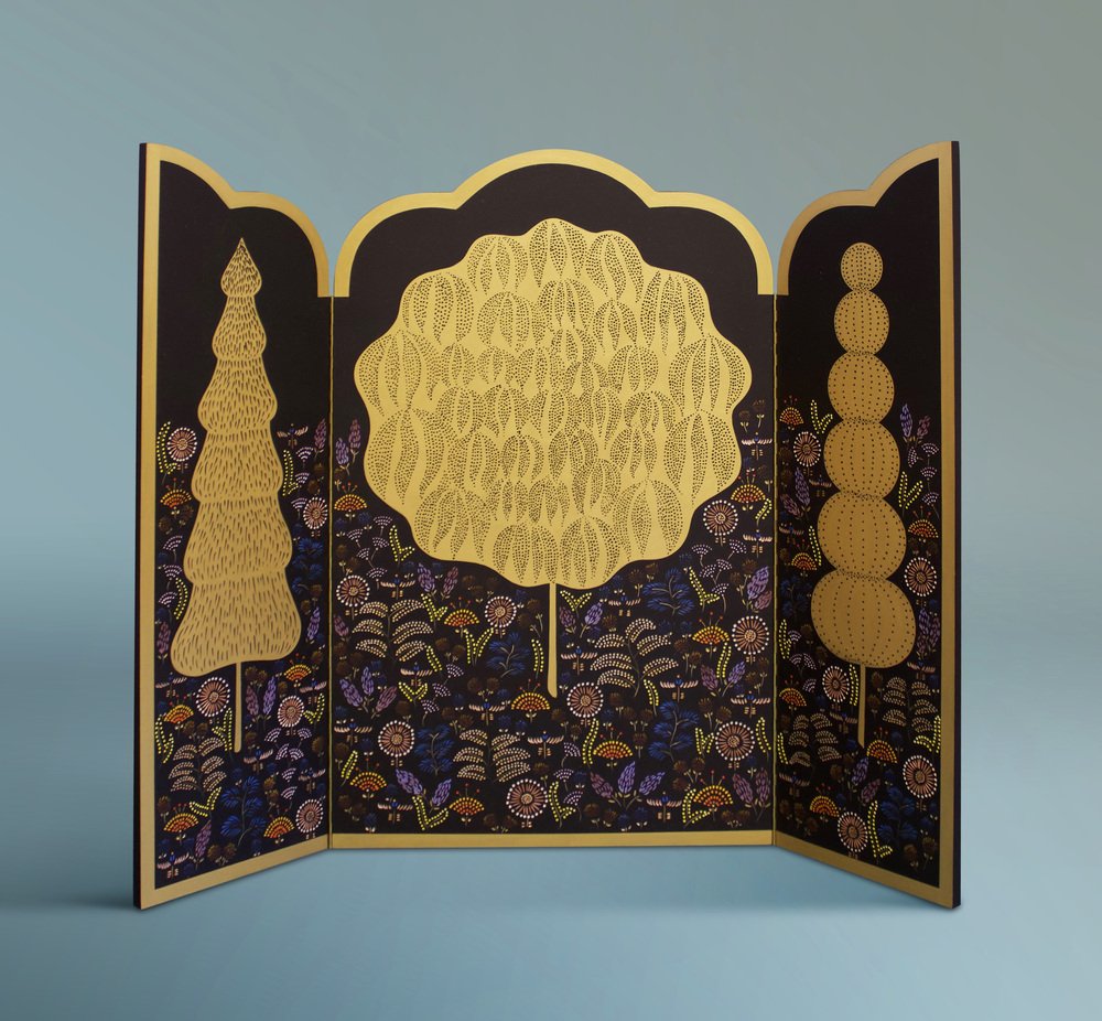 Her hand drawn imaginary trees and plants are repeated over the panels to create a balanced, harmonious design which are then carved and painted.
