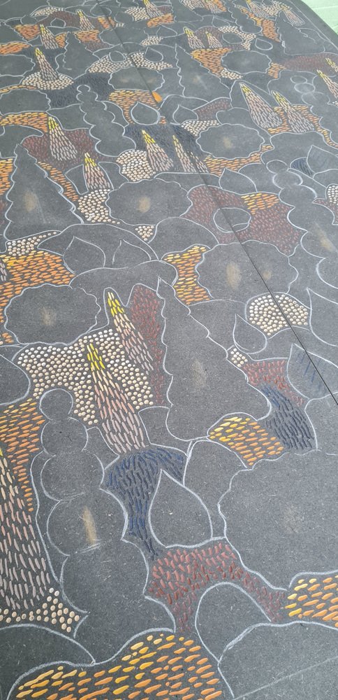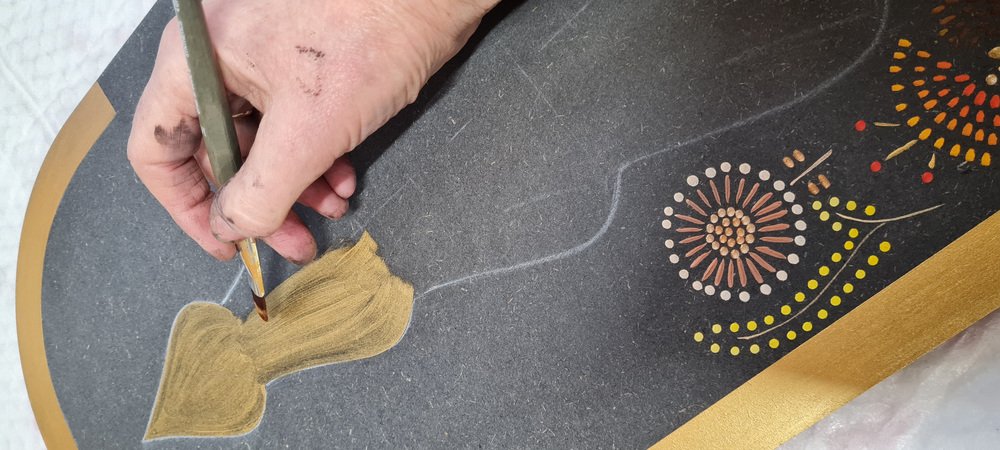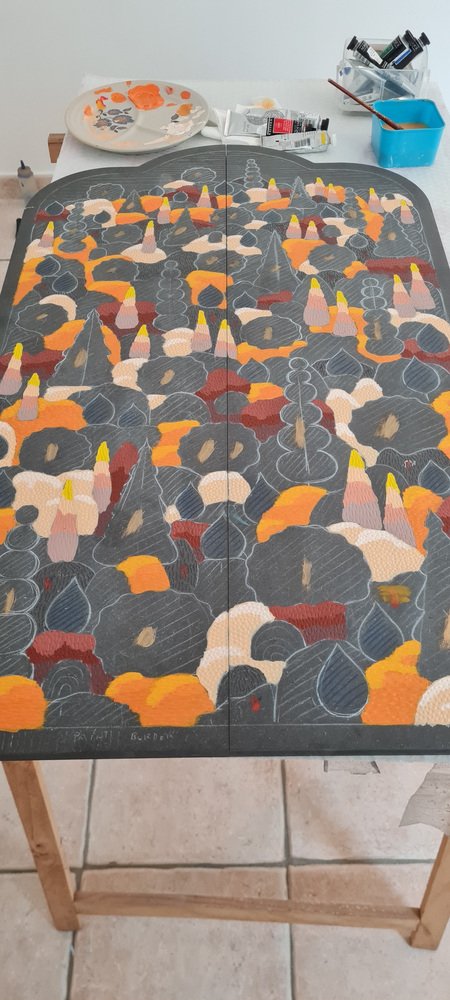 Ihre handgezeichneten imaginären Bäume und Pflanzen werden auf den Platten wiederholt, um ein ausgewogenes, harmonisches Design zu schaffen, das dann geschnitzt und bemalt wird.