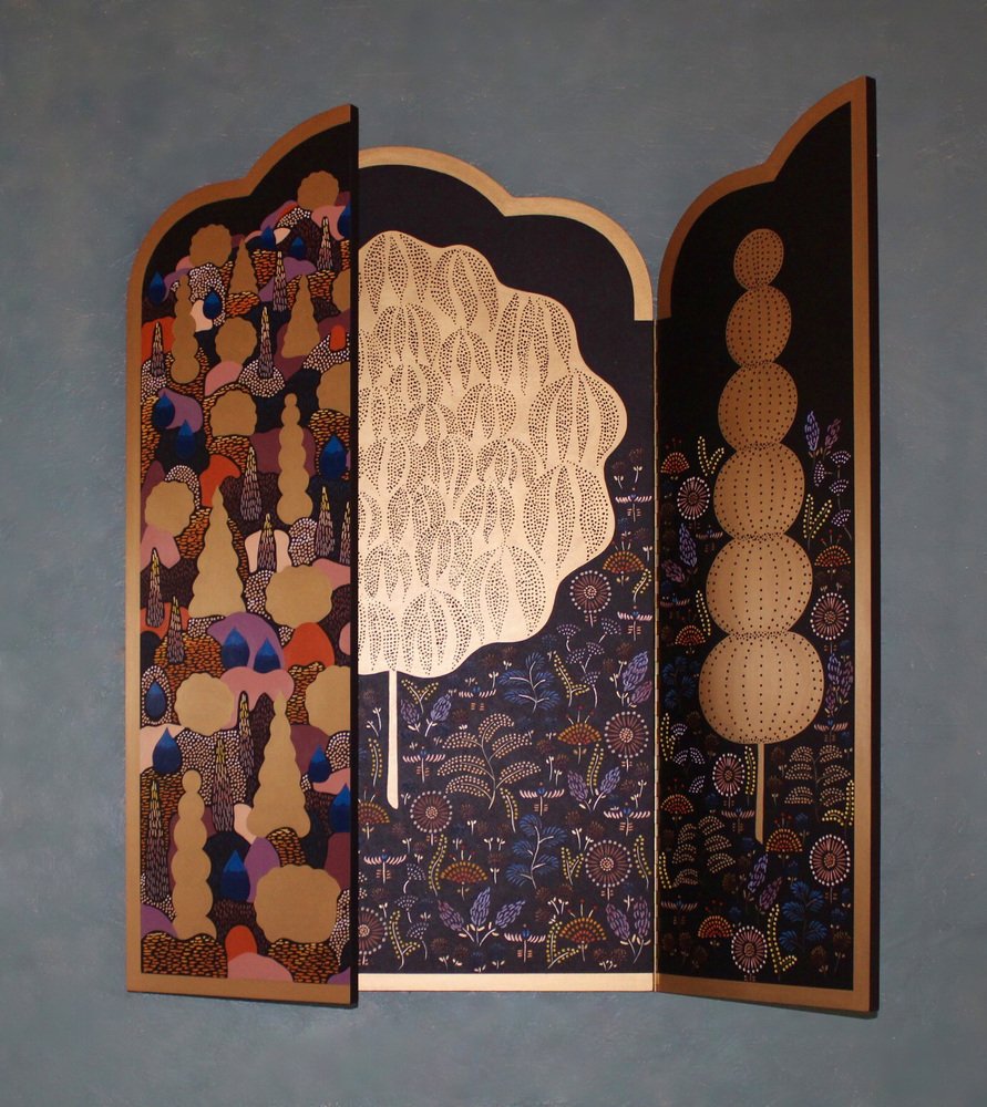 Ein wirklich einzigartiges Kunstwerk. Die Wonderland Triptychs basieren auf Nells Liebe zur Volkskunst und geben diesen wunderschönen, ungewöhnlichen Kunstwerken eine moderne Note.