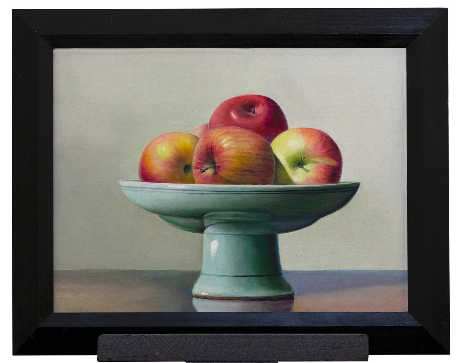 Original oil on canvas realized by Zhang Wei Guang in the early 2000s. Signed on rear. In excellent conditions, it includes a contemporary black wooden frame. Zhang Wei Guang, also called ‘mirror' was born in Helong Jang, China in 1968. He studied at the Haierbin Teacher University and at the Ruxun Art University. He exhibited his first solo shows in 1995 in Helongjiang province. His first international solo show was in Boston in 2000. Having made a deep formative research about the cromatism of oil painting technique, the artist interprets the objects of the tradition through a ‘photographic' pictorial yield. His works are often still-life representations, like scenographic sets of flowers, painted potsherds and glass bowls, fruits. His little and medium size canvas show daily life objects, resting on tables of modern houses. The choice of diffuse and soft lights, with delicate and bright chromatic solutions provides an atmosphere of silent and intimate harmony. Recovering the guohua chinese tradition of the representation of landscape and the typical sino-intimateness of the pictorial floral decorations, his works celebrate the beauty of his culture. The art of composing is another typical element of the chinese esthetic heritage that mirror, as shown by his artistic name, knows well and re-creates on canvas. The choice of still-life painting subjects let him perform a poetical research about the relations between the forms of daily life objects and their evocative color tones.